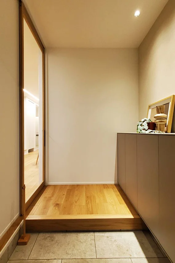 玄関を入ると、フローリングの木のぬくもりと落ち着いた照明がやさしく迎えてくれます。