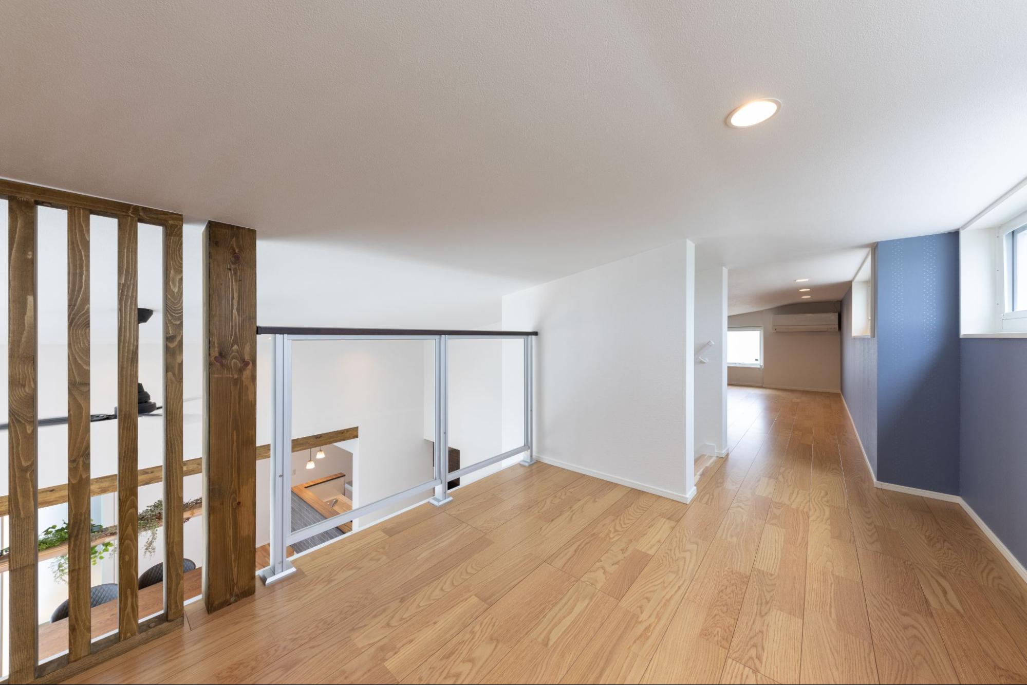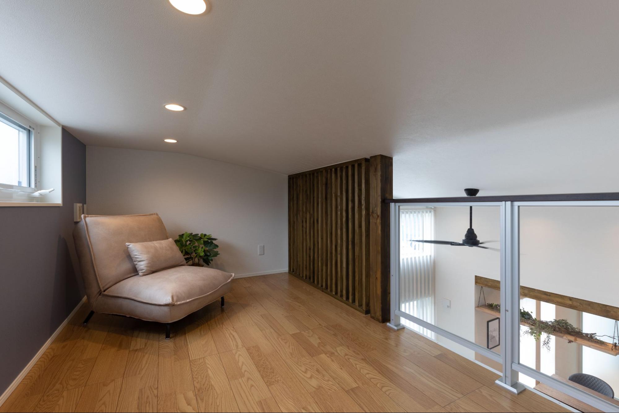 ロフトからは一階全体を見渡せて、開放感があります。空間を縦に使うことで、坪数以上の広さを感じられる住まいです。