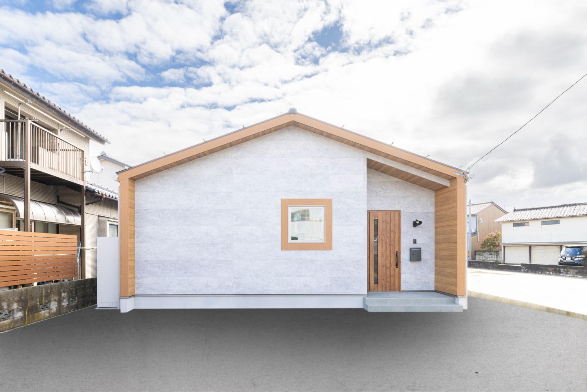 外観は三角屋根と木の板張りが印象的で、やわらかな温もりを感じるデザイン。玄関の木製ドアとポーチライトがアクセントとなり、温もりのある雰囲気を演出しています。