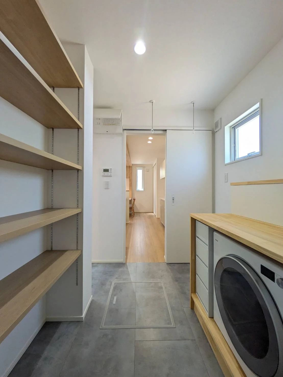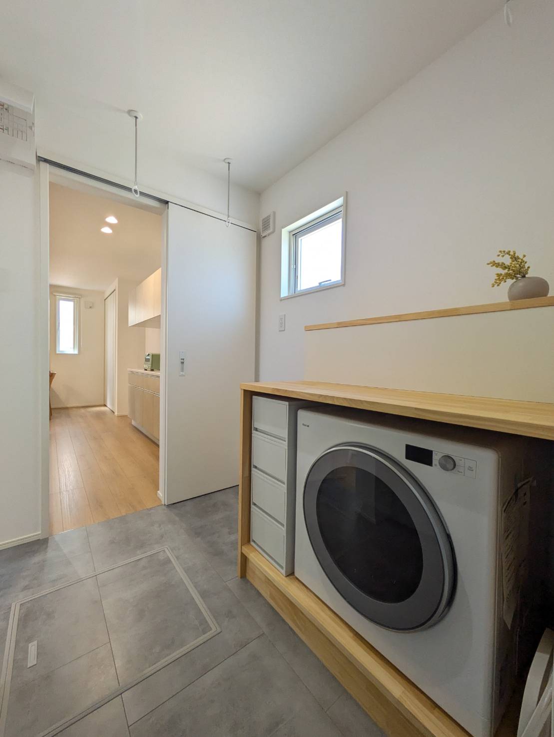 ランドリールームの広さは約3帖。一直線にまとめた水回り動線で洗濯から収納まで効率的に行えるのも魅力です。