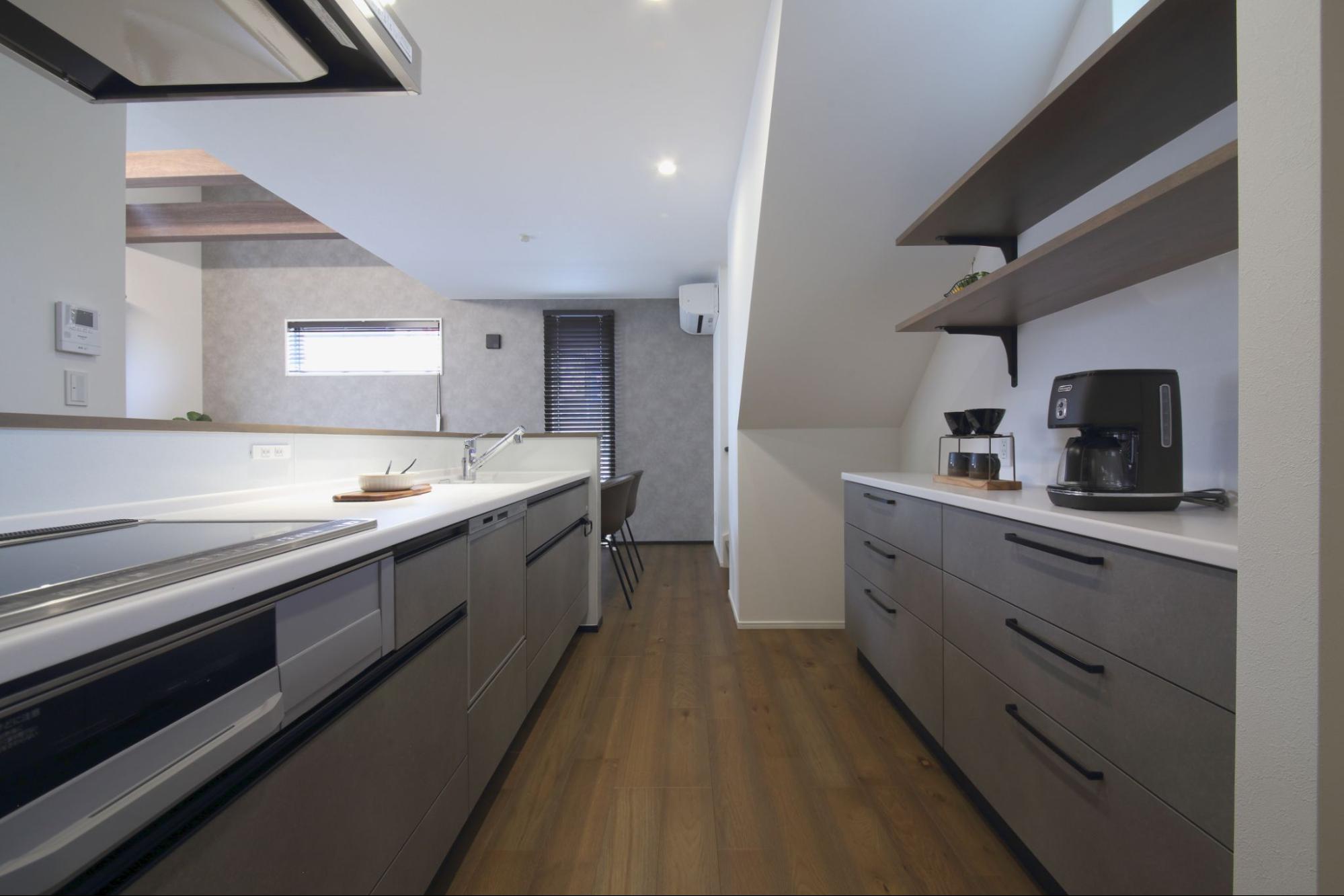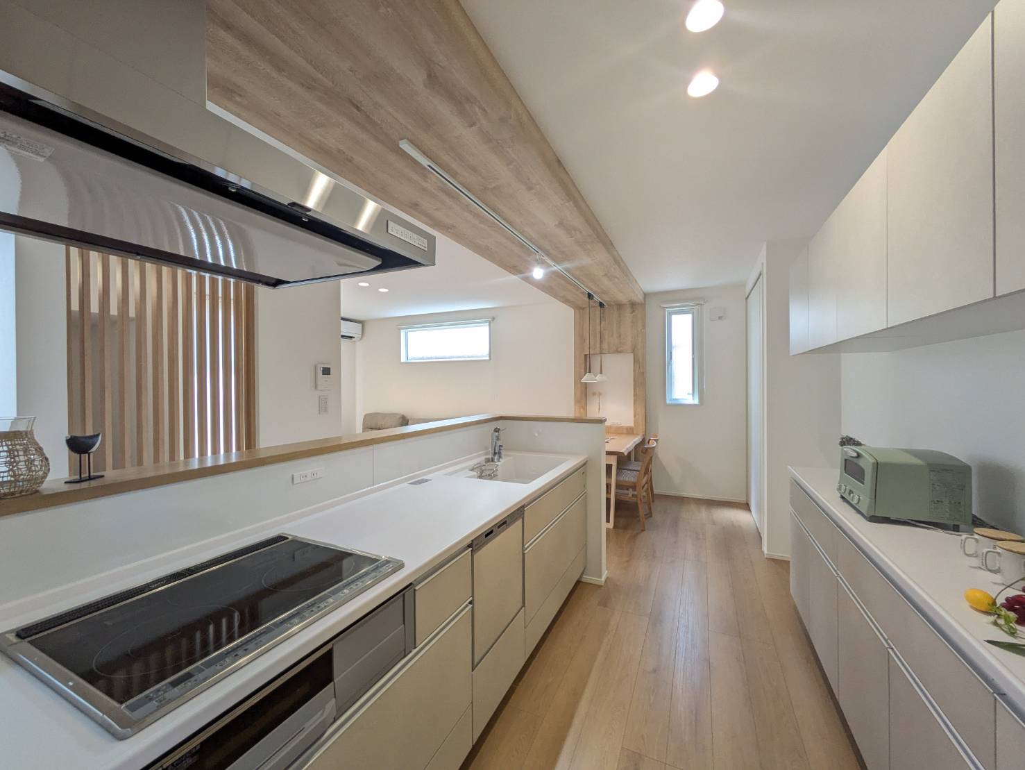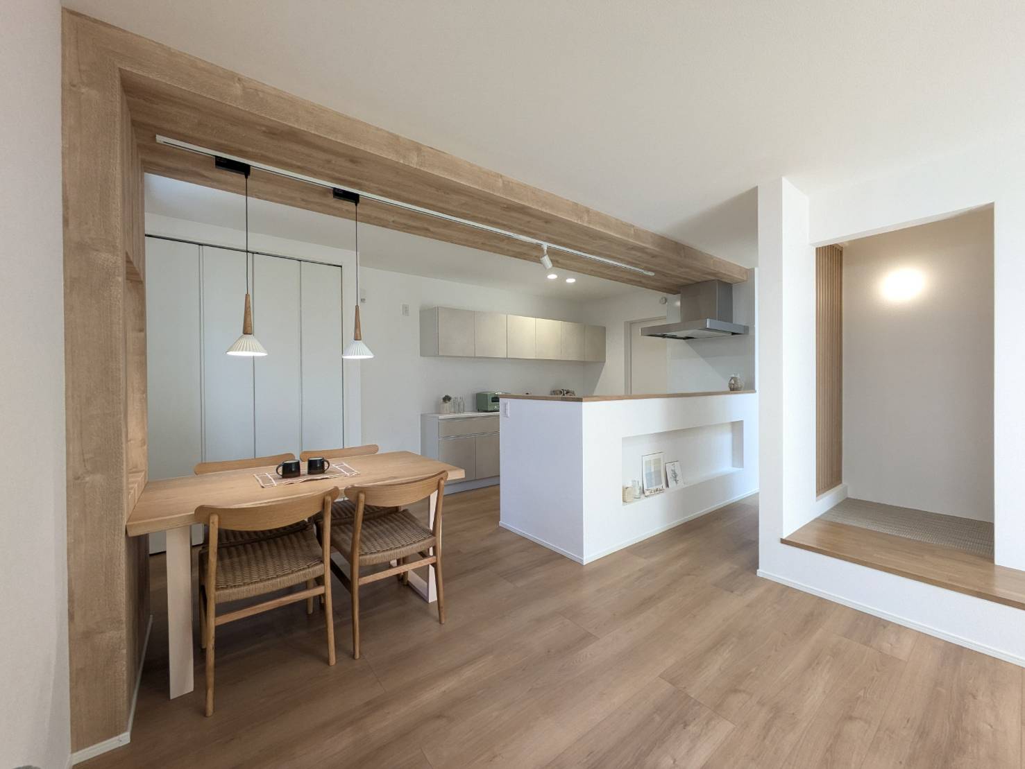 ダイニングとキッチンの上部には下がり天井を設置。日常に特別感を添えるデザインとなっています。
