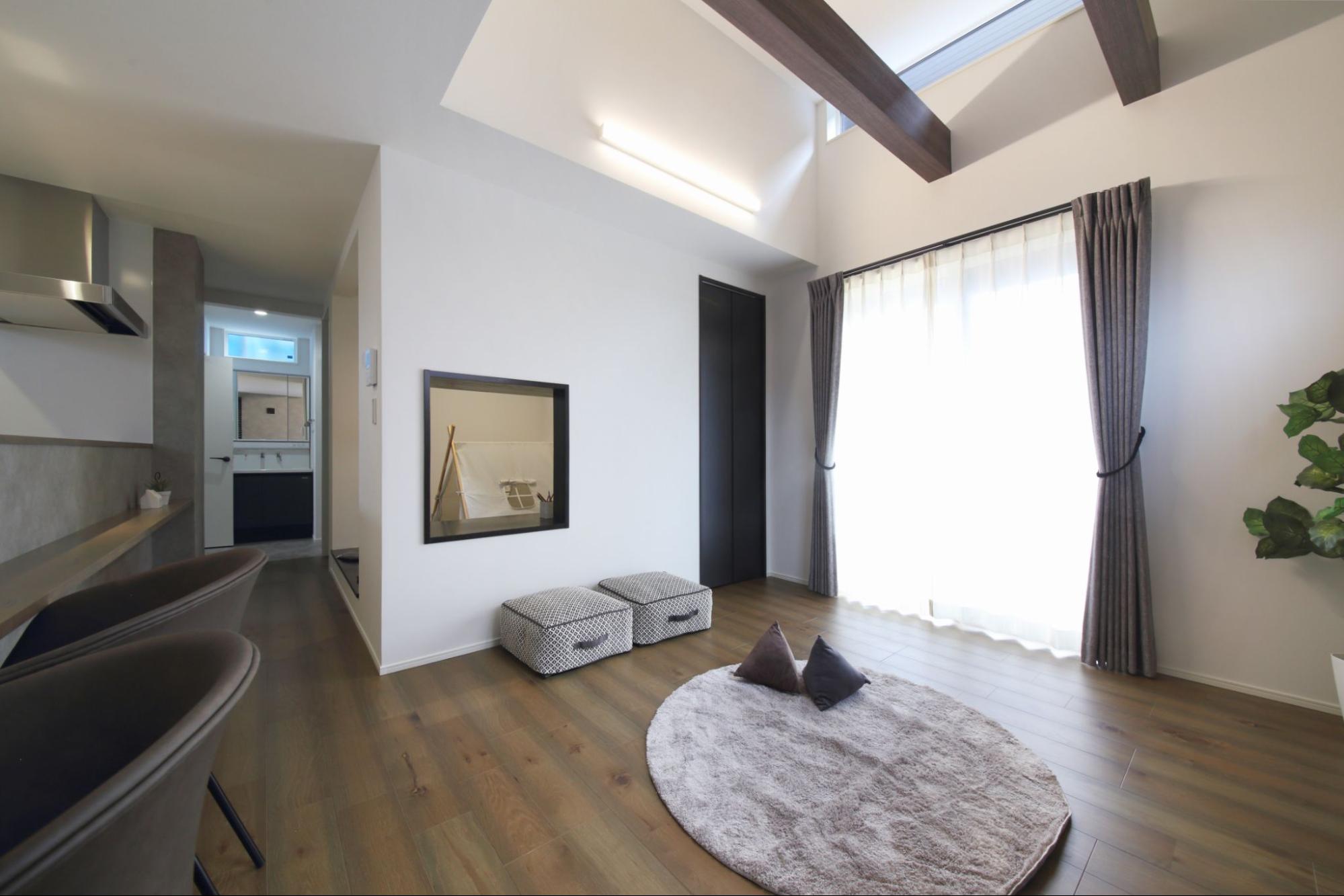 リビングは高天井に梁を見せ、光がたっぷりと差し込む開放的な空間に。