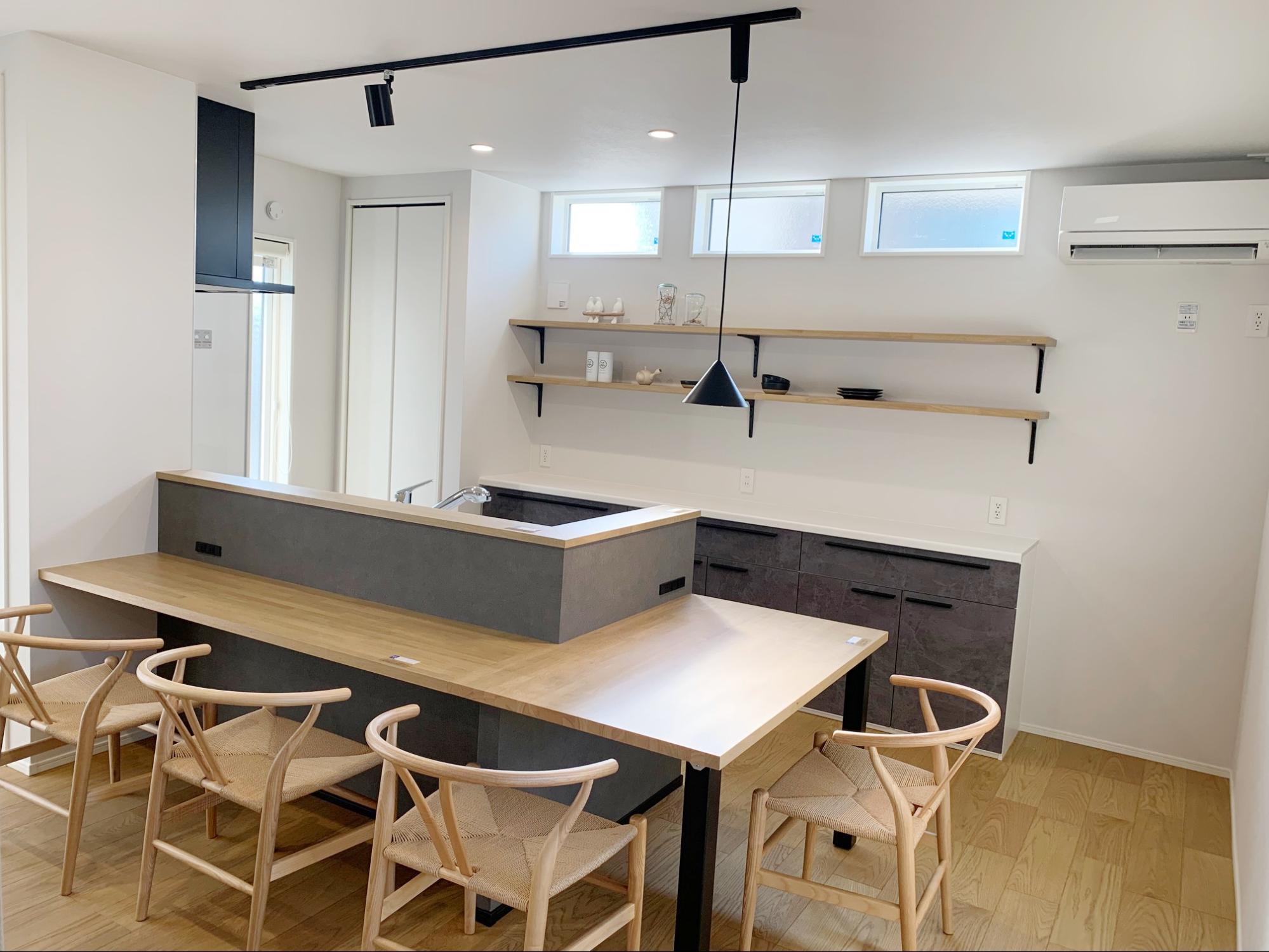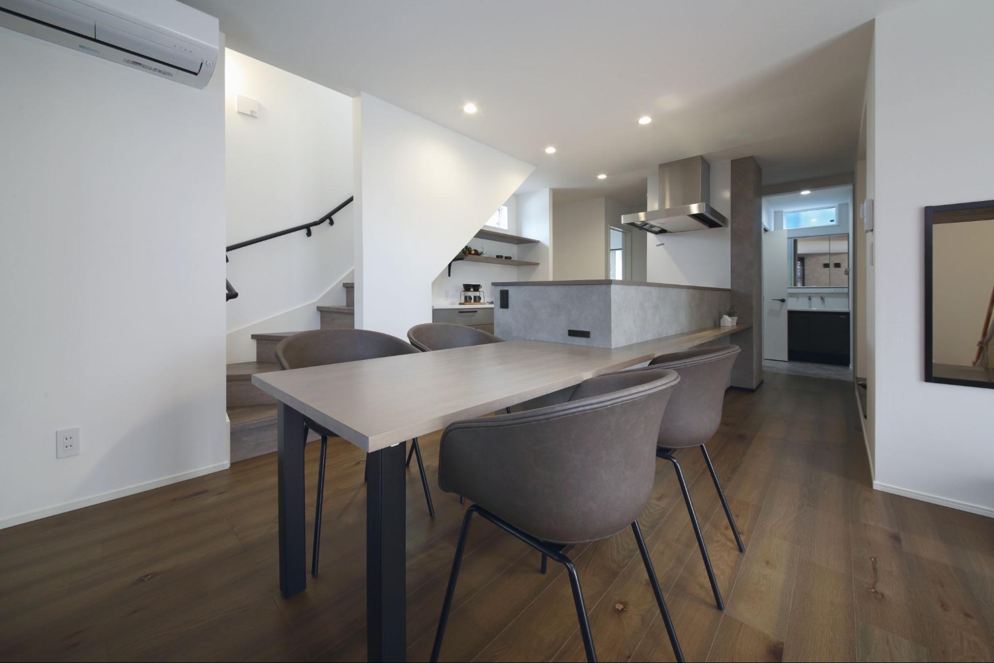 キッチンと一体型の造作ダイニングテーブルは、カフェのようなおしゃれな雰囲気がありながらも、配膳や片付けがしやすいデザインです。
