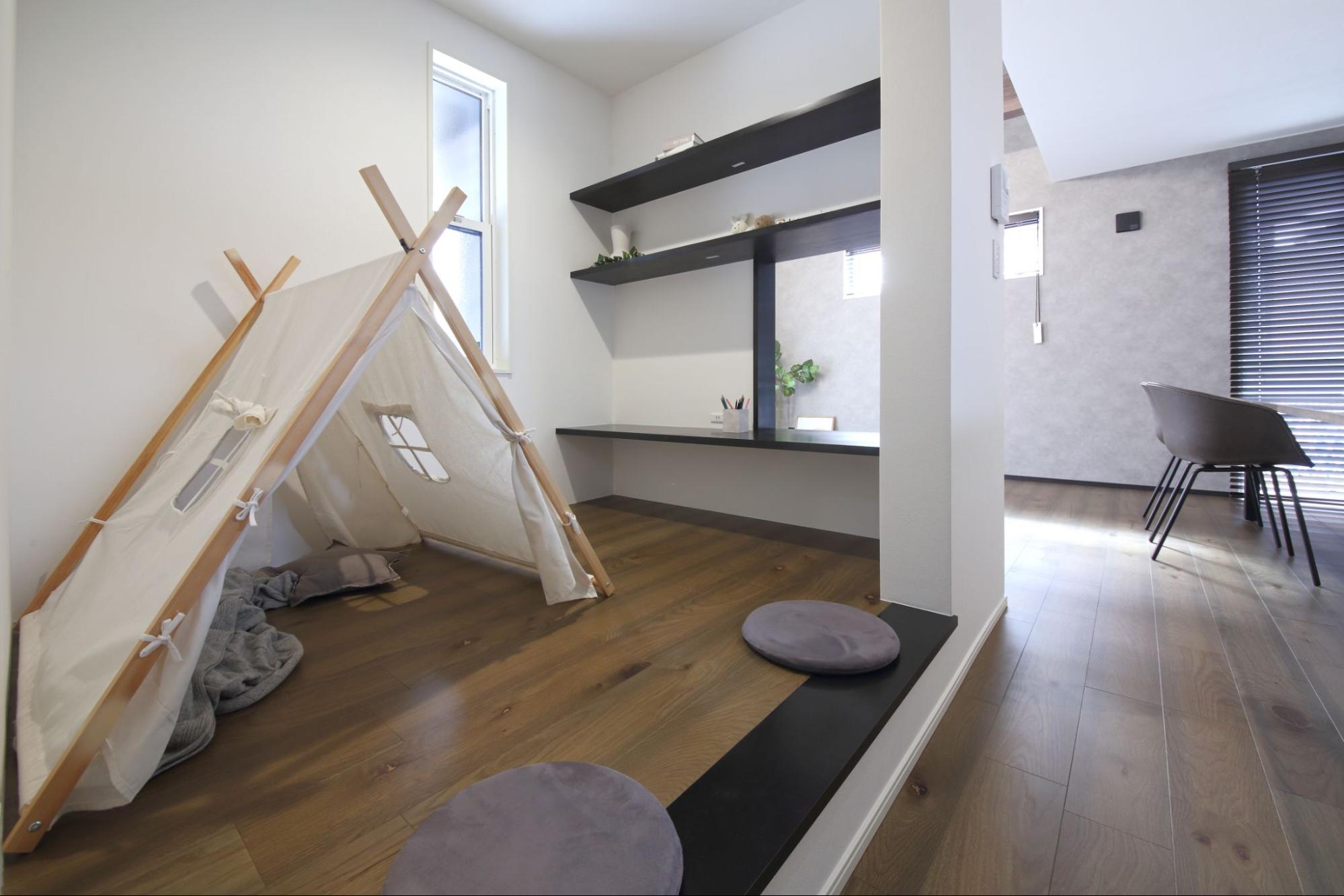 小上がりヌックは勉強や遊び場として、家族が集まれる居心地の良い場所として最適。ヌックとリビングの間にある壁の開口部を通して会話が自然に生まれます。