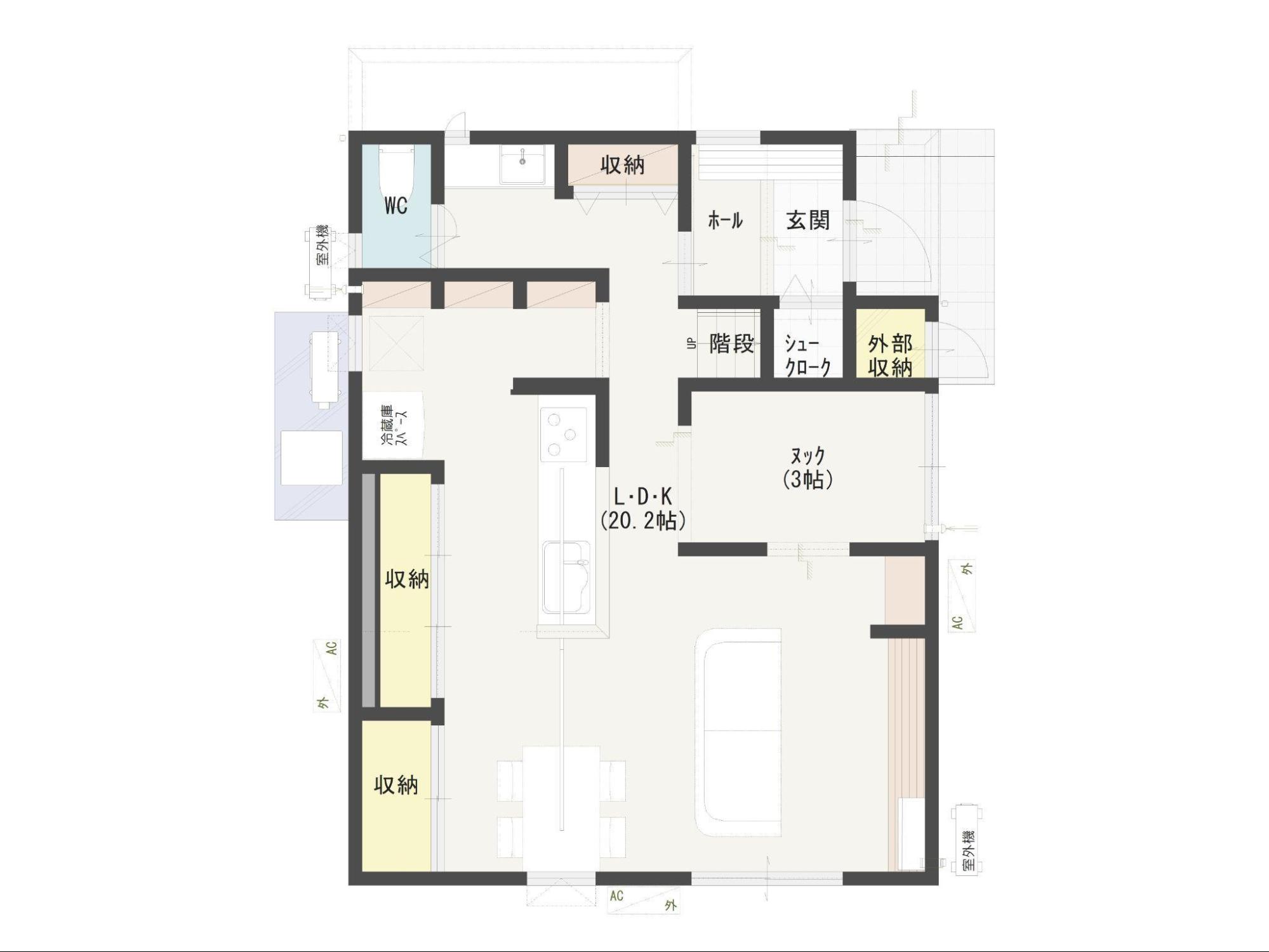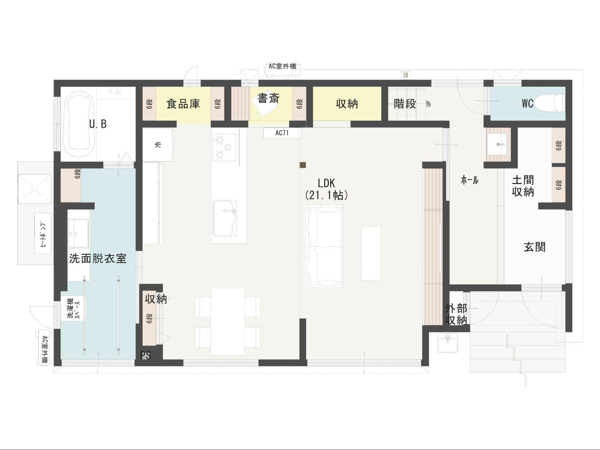 家族がシューズクロークから洗面、トイレスペースに帰宅動線で接続でき、来客もプライベートスペースに入らずに手洗い・トイレに接続できる動線となっています。