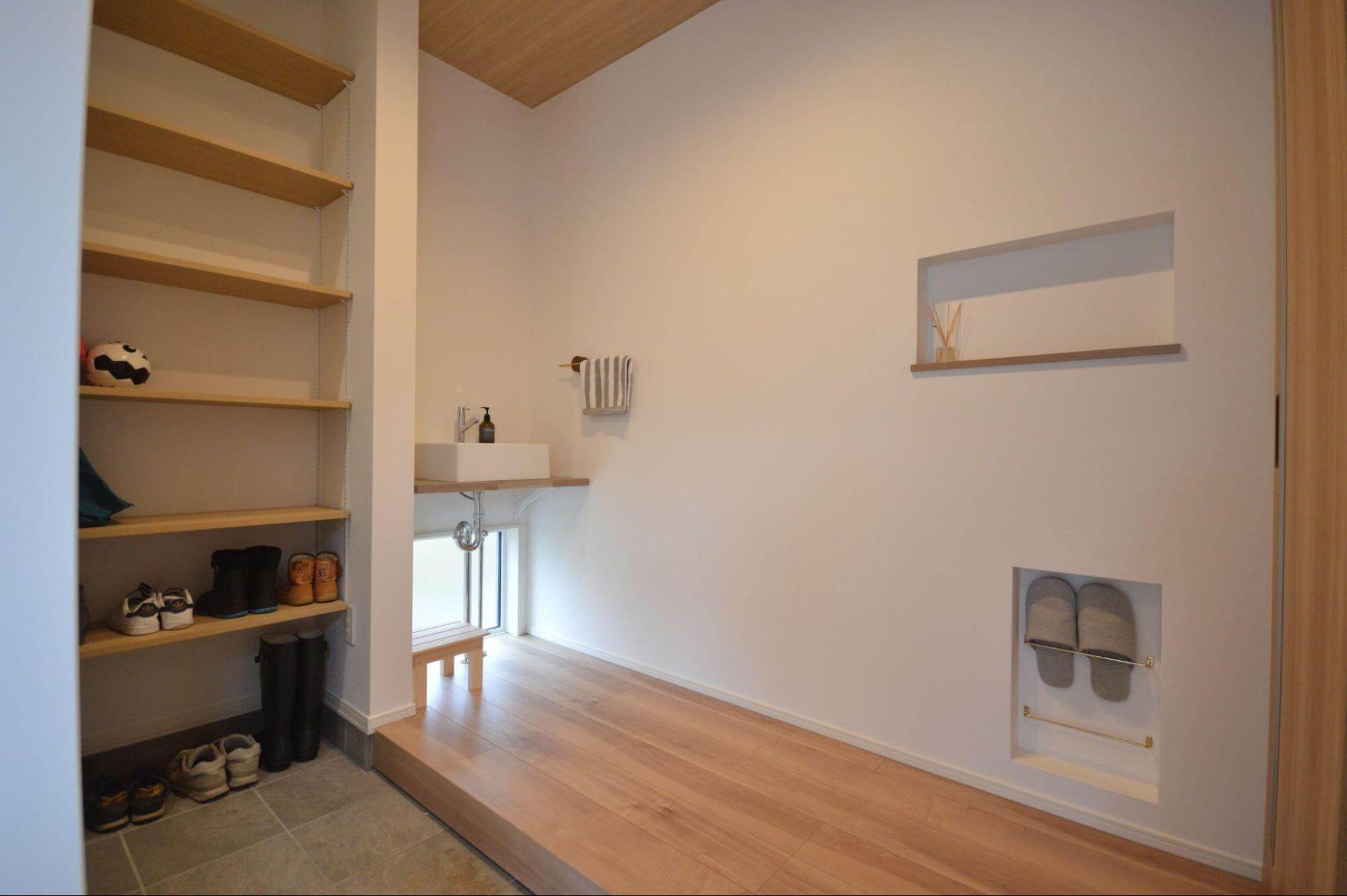 玄関に隣接して設けた、ウォークインタイプのシューズクローゼットや玄関ホール直通のスペースに手洗い場を設ける方法もあります。