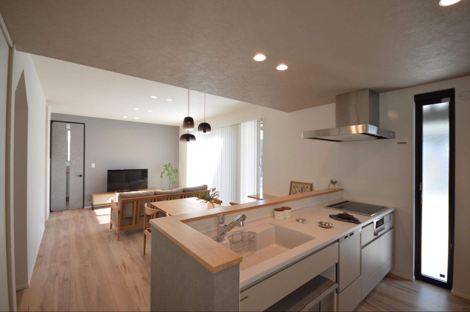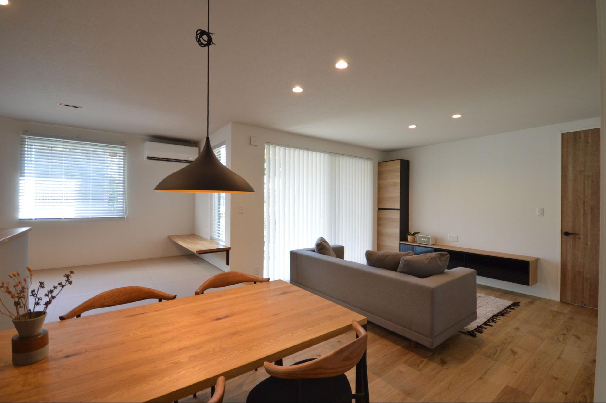 床や造作部材には、木の温もりを感じさせる素材を使用し、ナチュラルな雰囲気を演出。一方で、ダイニングの印象的なペンダントライトや、TVボードのブラックな部材など、モダンな要素を取り入れることで、スタイリッシュなアクセントを加えています。