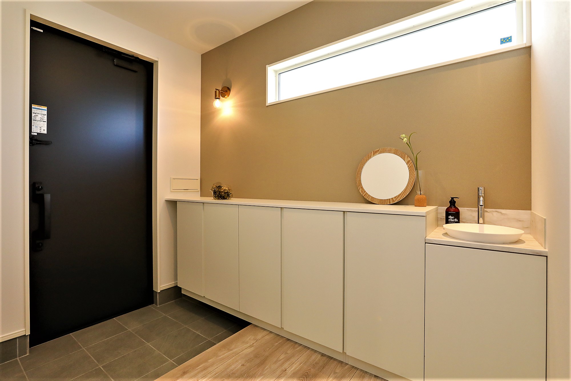 玄関近くには、清潔感のあるコンパクトな手洗い場があり、スペースを無駄にせずスッキリまとまっています。