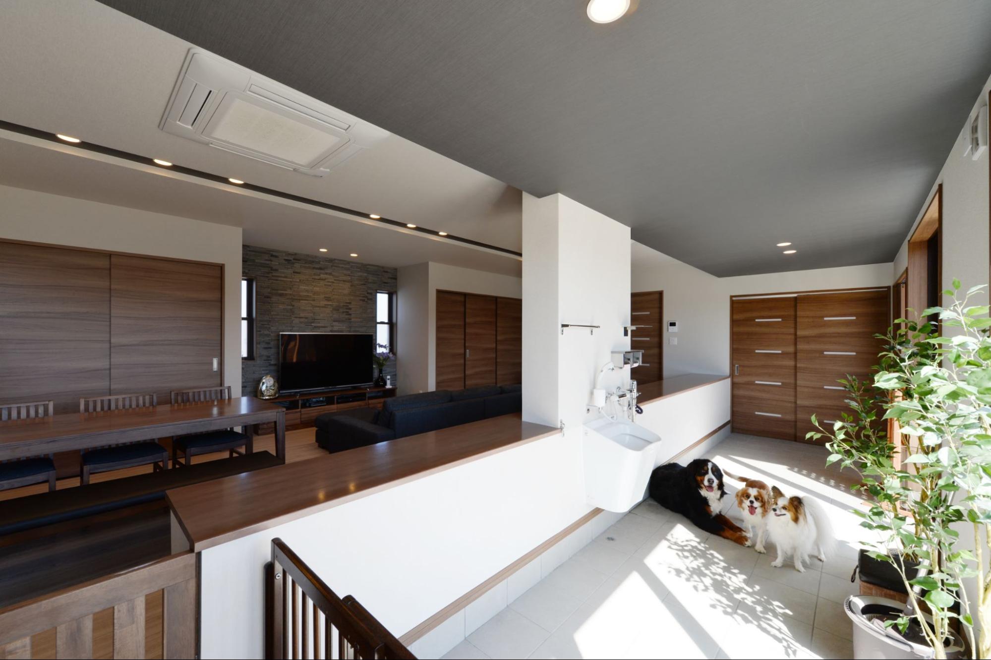 タイル床なので掃除も簡単。雨の日でも安心です。家族のそばで過ごせて、しっかりスペースも分けられる工夫が施されているので、ペットとも快適に過ごせる住まいとなっています。