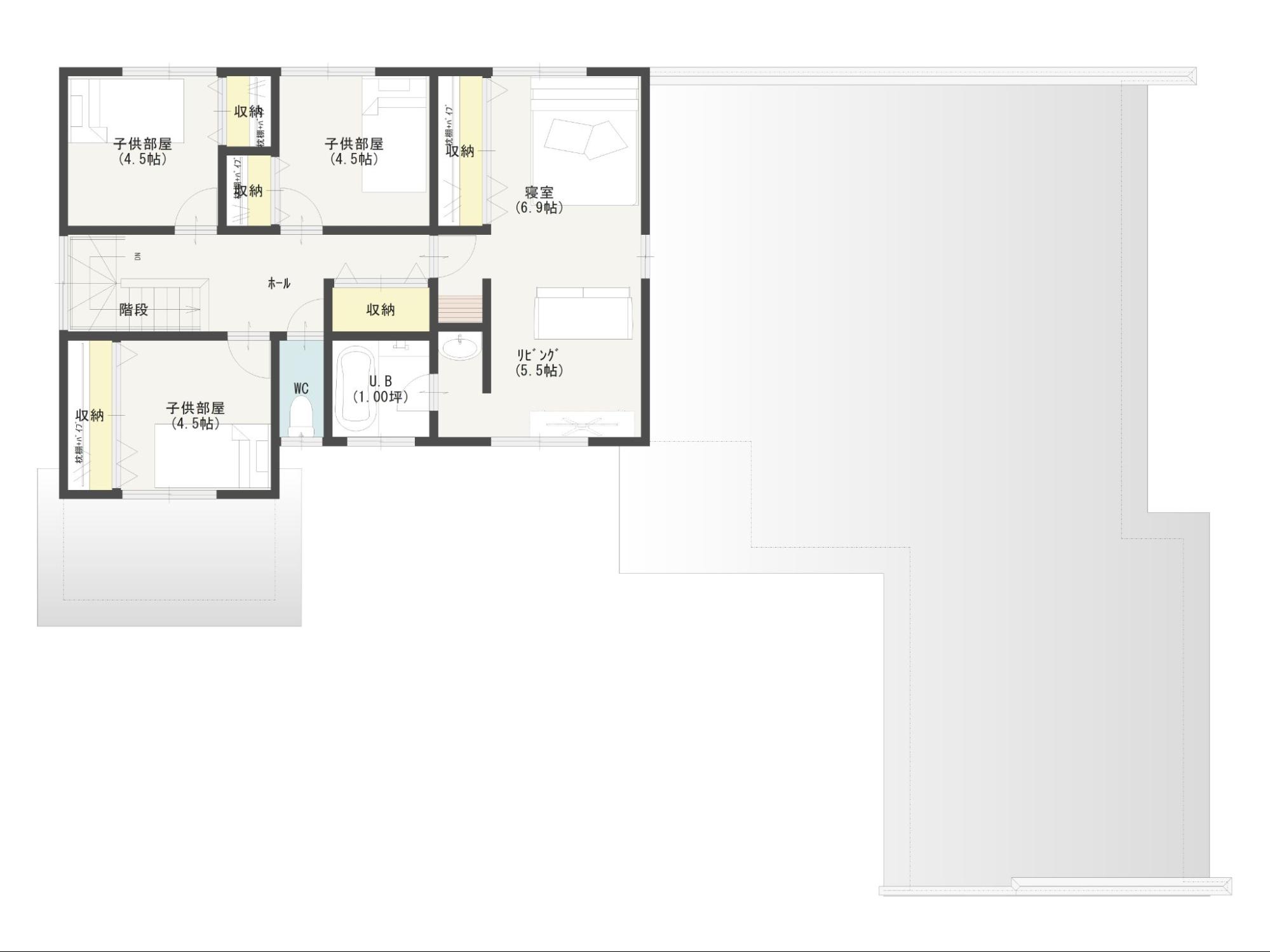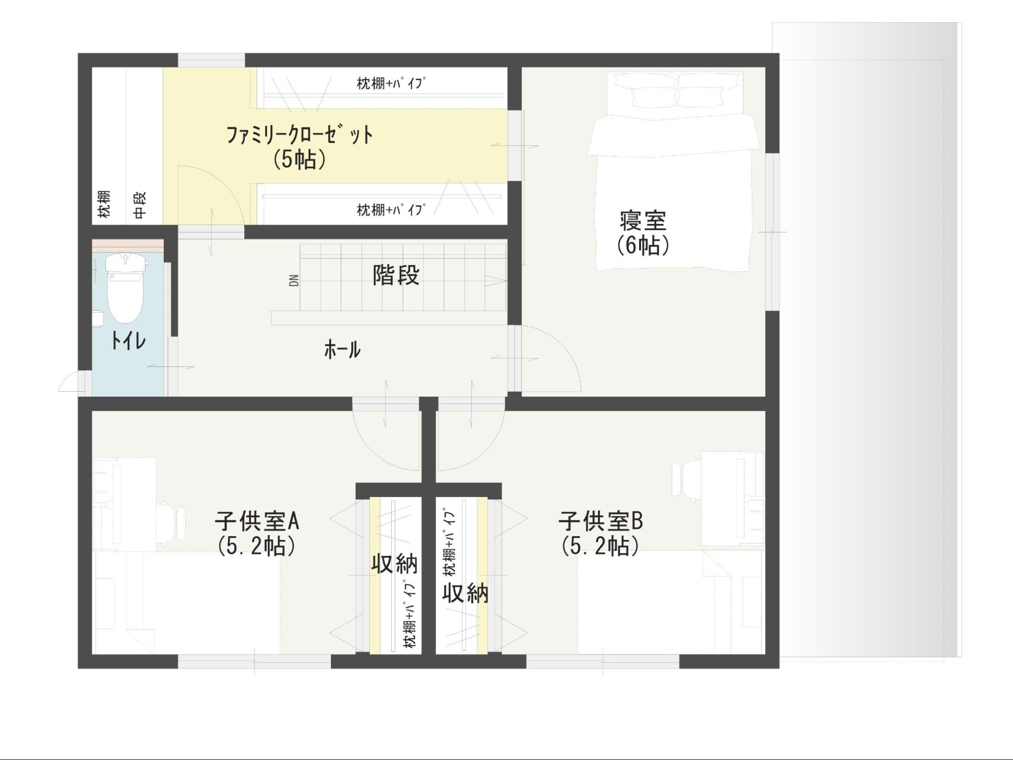 例えば、家族の部屋がすべて同じフロアにあるため、プライバシーが保たれにくいという声も。これを解決するために、廊下を挟んで部屋を配置したり、両親の寝室と子供部屋を家の対角線に分けたりする間取りが人気です。