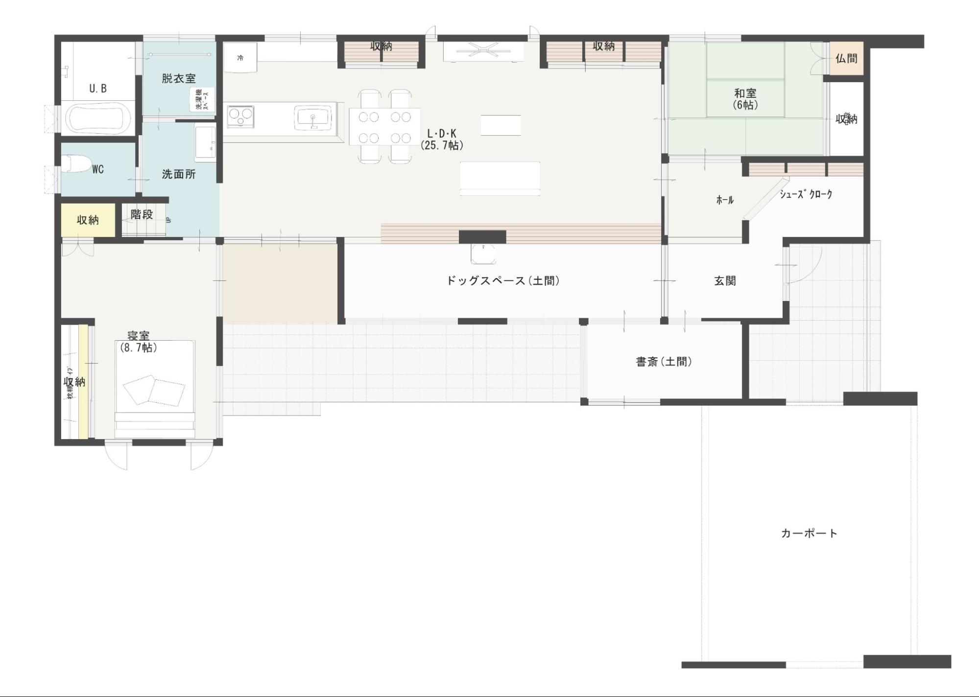 こちらは、平屋住宅の事例です。全ての部屋がワンフロアにまとまっていながらも、ホールを使って空間を分けているため、プライバシーがしっかり守られています。