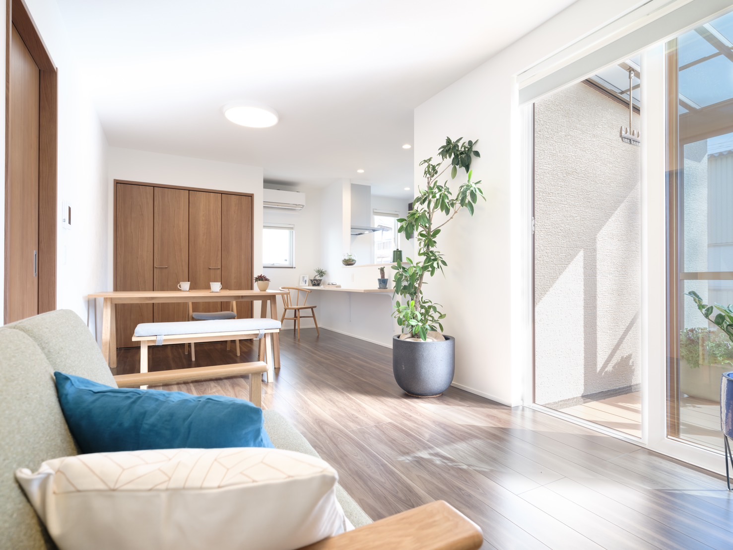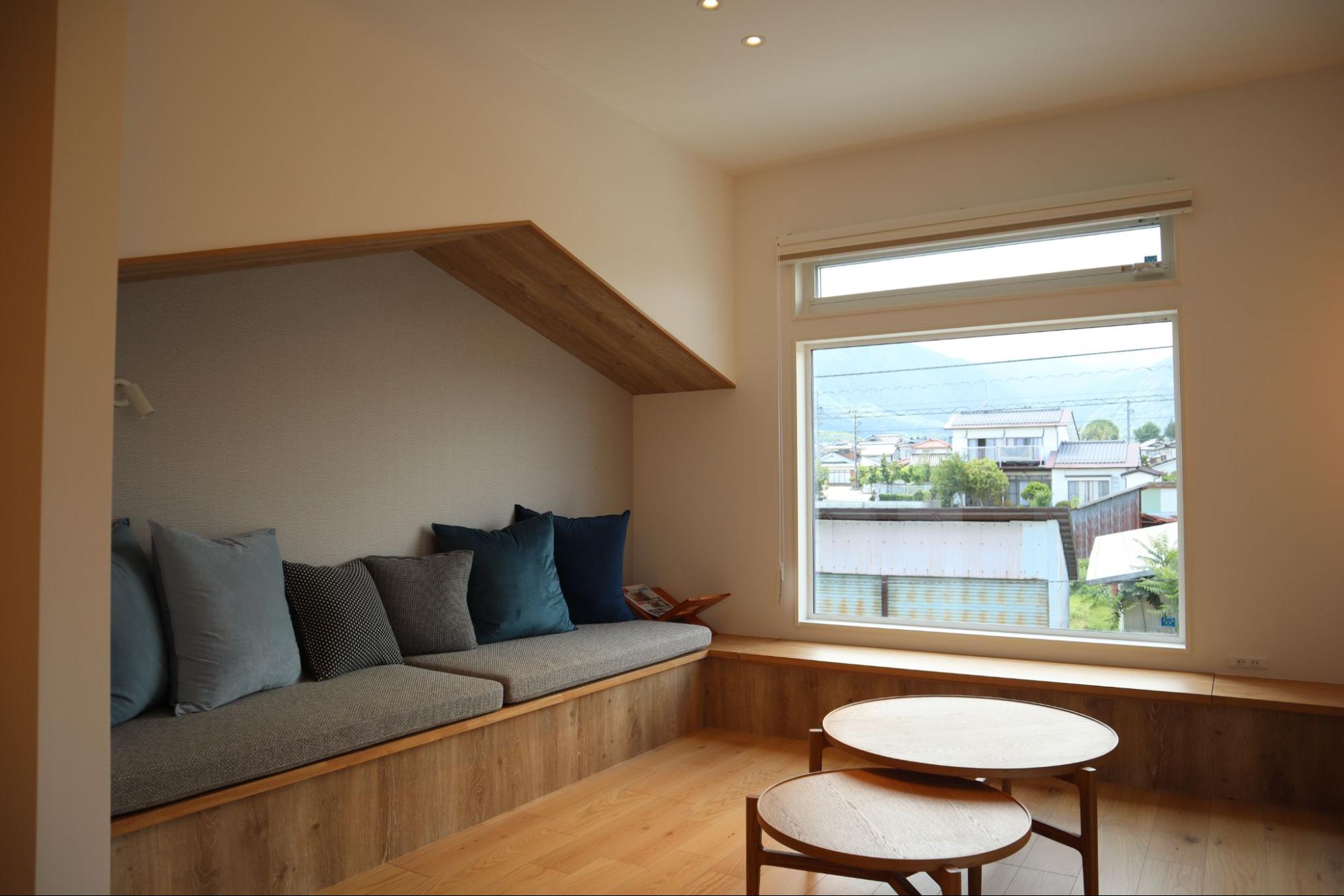 リビングには、おしゃれな造作のソファ―ヌックや窓際ベンチが配置されており、家族みんなでくつろげるスペースとなっています。