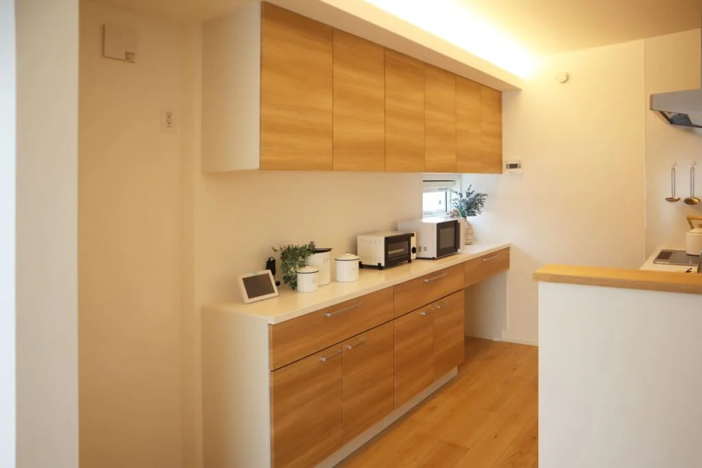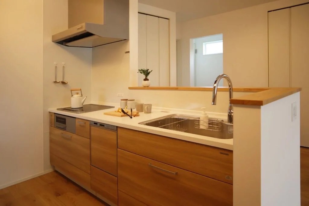 キッチンには、ビルトインのヒーターや食洗機を設置し、家事動線もスムーズで快適。大容量の収納スペースも確保されており、スッキリ空間を保てます。
