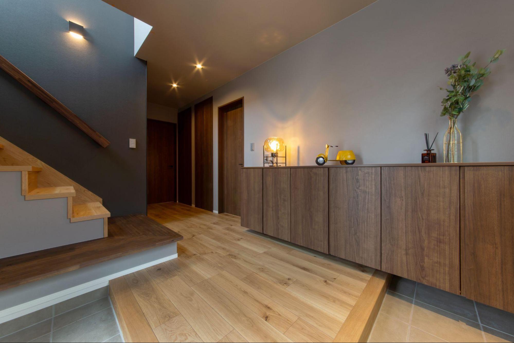 玄関には、デザイン性の高い階段を設置。住まいの顔となる玄関ホールを、華やかに彩っています。この事例は、2階リビングの特長を最大限に活かした、上質な暮らしを求める方におすすめの間取りです。