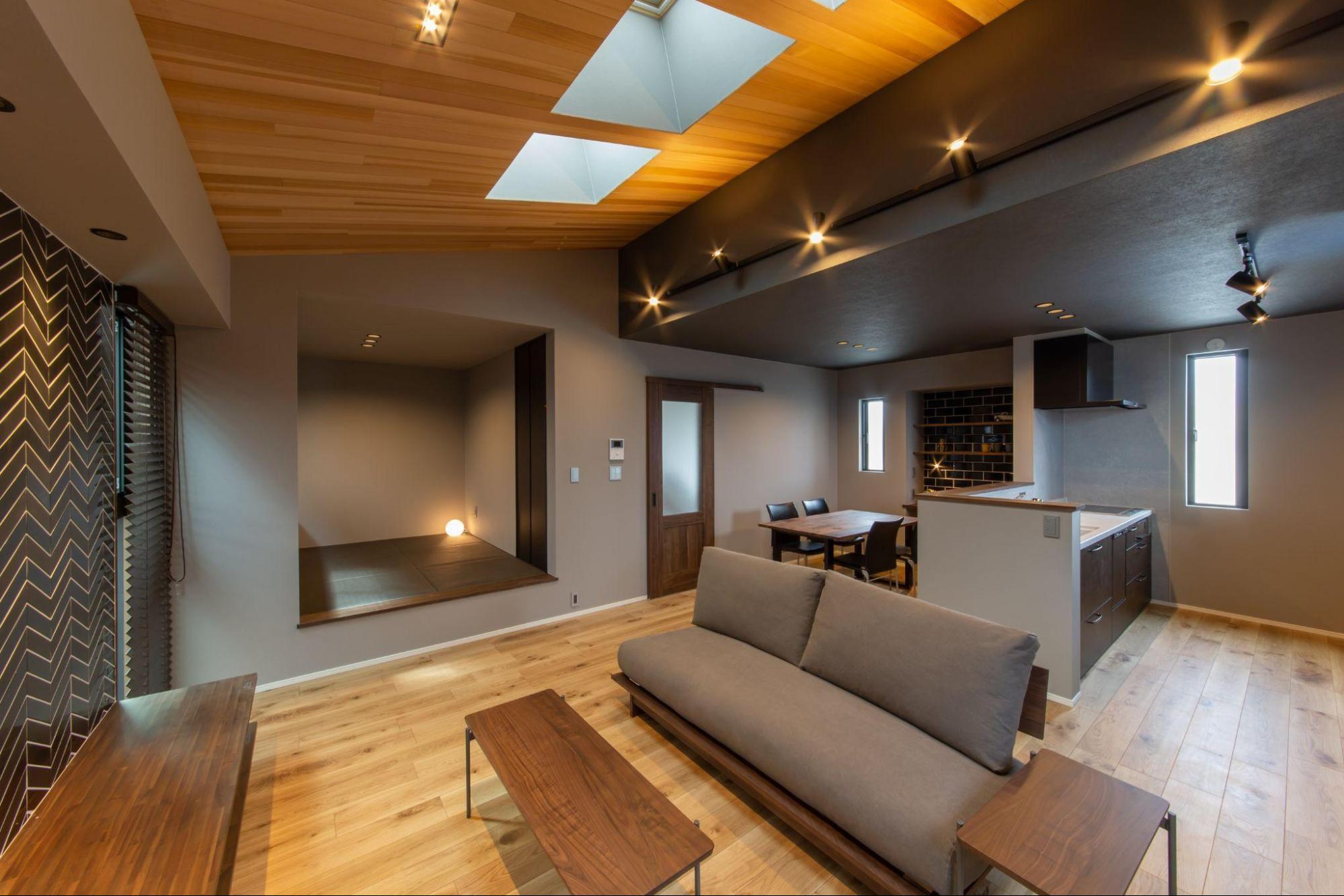 2階リビングならではの天井高を生かしたデザインは、天窓から降り注ぐ光によってさらに開放感を演出。ダークなインテリアながらも、明るく温かみのある空間に仕上がっています。