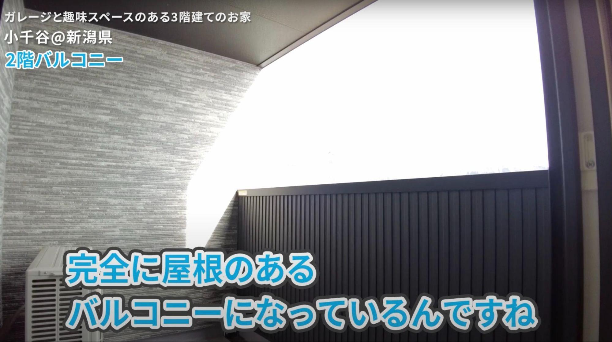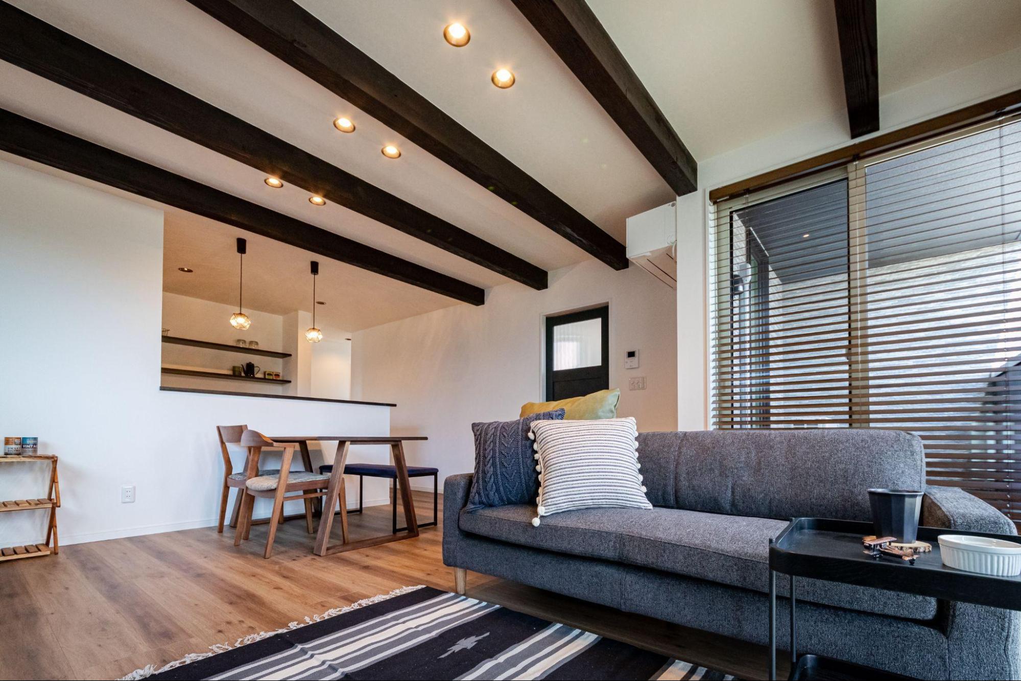 2階のリビングは、梁の意匠が印象的な開放的な空間です。バルコニーは屋根付きなので、天候に左右されることなくアウトドアリビングとして楽しめます。