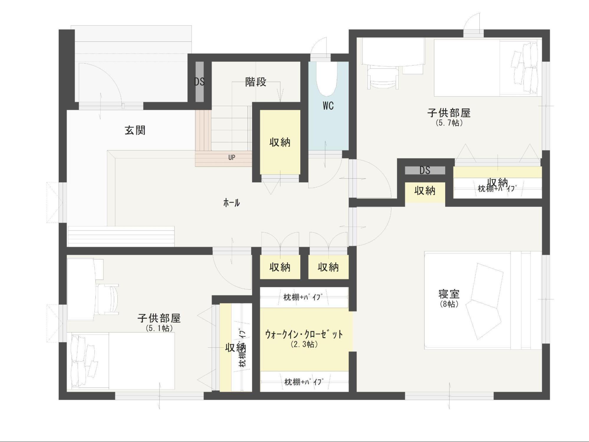 3階は子供室フロアです。勾配天井の廊下は、子供たちの遊び心を刺激するワクワク空間になっています。収納も工夫されており、子供たちが快適に過ごせる設計です。