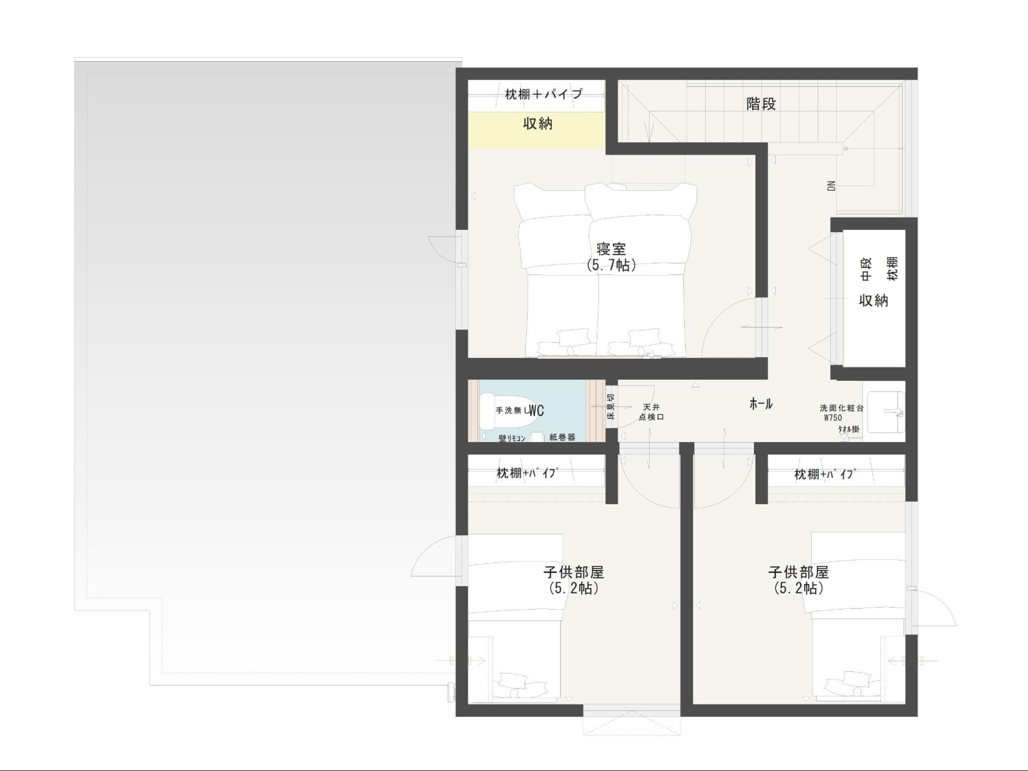 この間取りのポイントは、2階にある3つの部屋からどこへ行くにもアクセスしやすい場所に洗面台が配置されている点です。家族みんなが快適に使える、機能的な間取りと言えるでしょう。