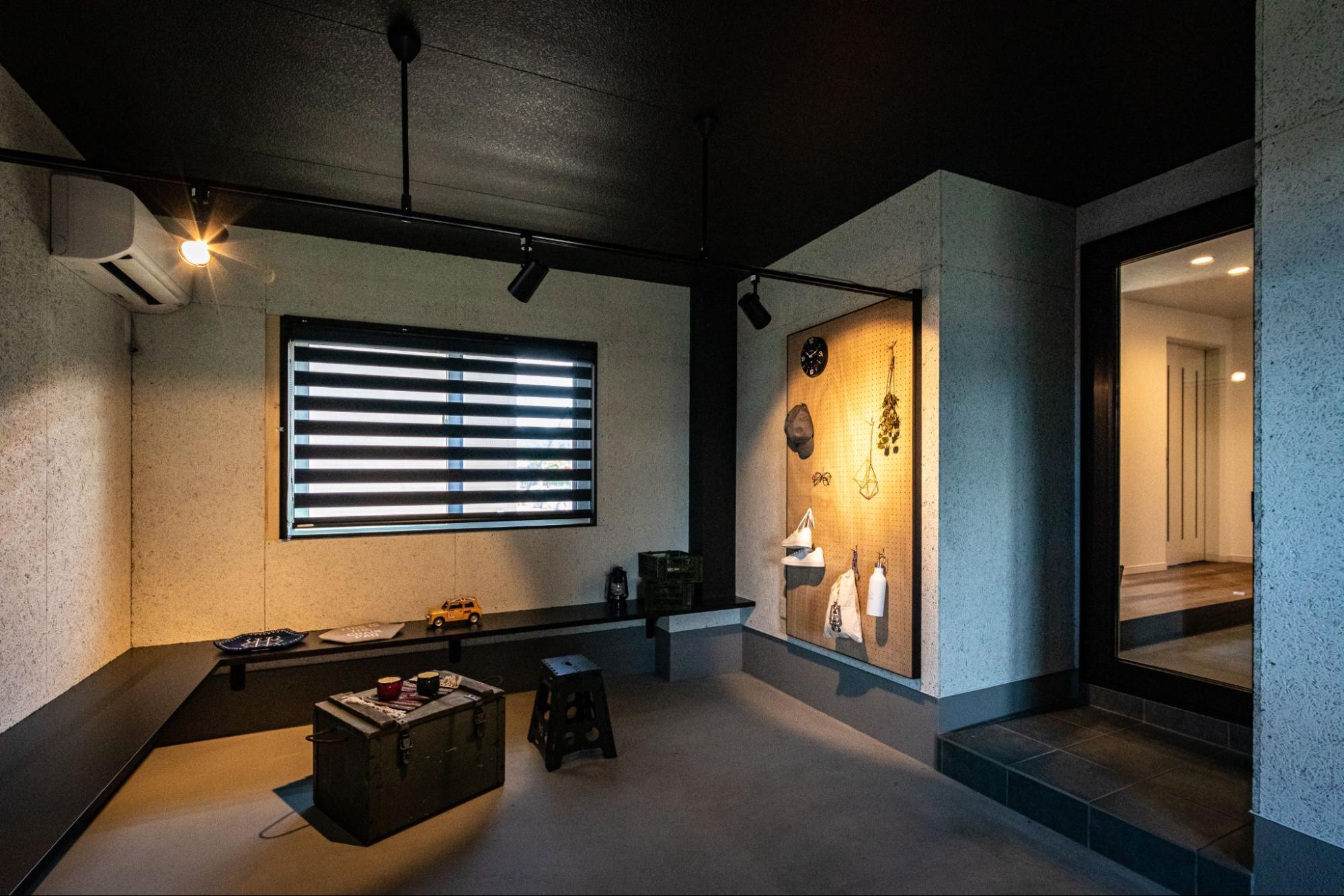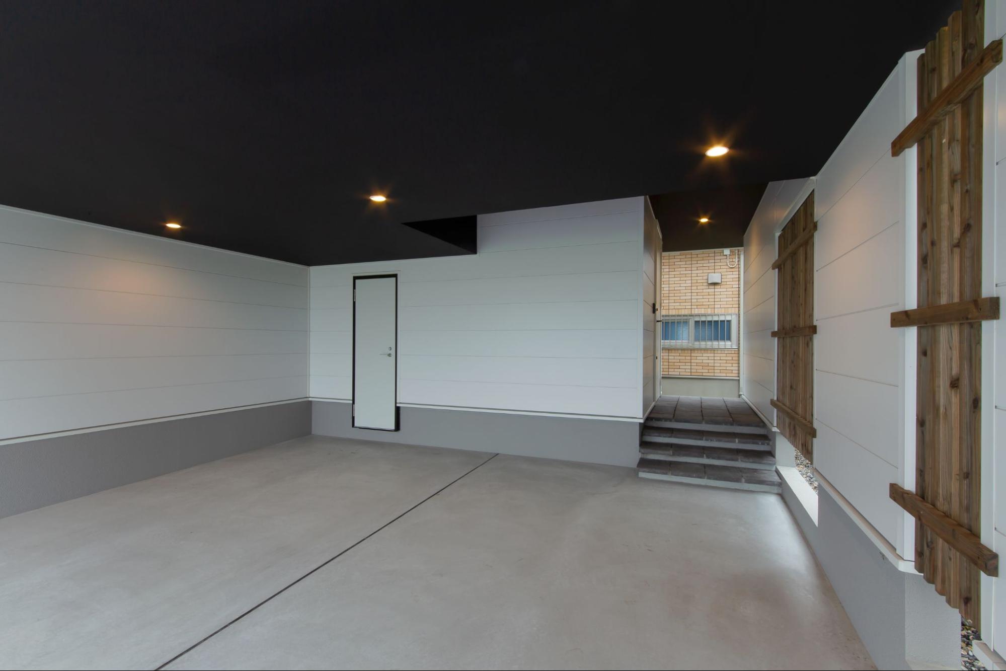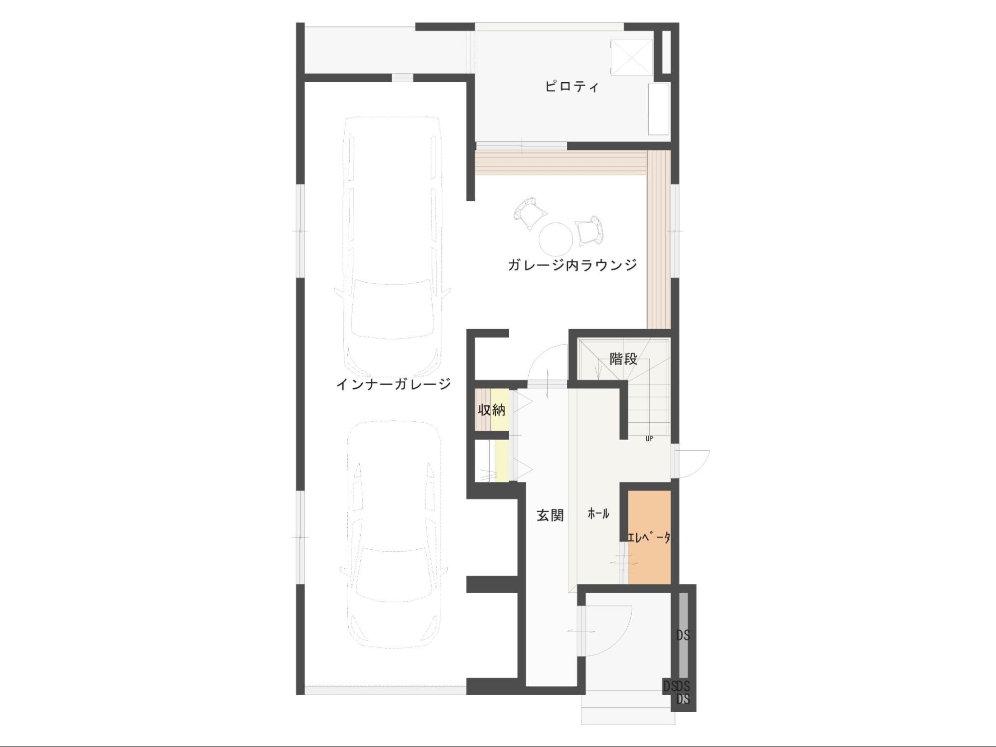 こちらは、1階に車のメンテナンスや外作業ができるスペースを設けた間取り事例です。インナーガレージでは、愛車を眺めるフリースペースもあります。