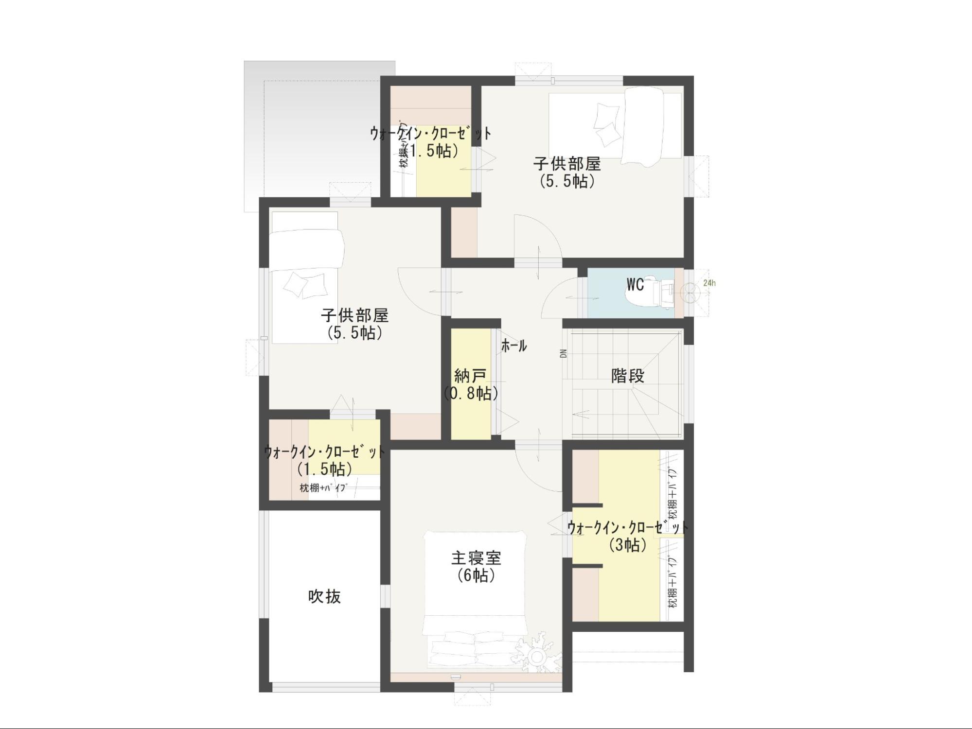 2階には寝室、子供部屋、書斎があり、テレワークにも対応可能。屋根裏は書斎や収納として利用でき、限られたスペースを縦に活用することで、快適な生活空間を確保しています。