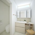■空間をおしゃれに飾る、リビングの造作TVカウンターとエコカラット、洗面コーナーの造作洗面台。
