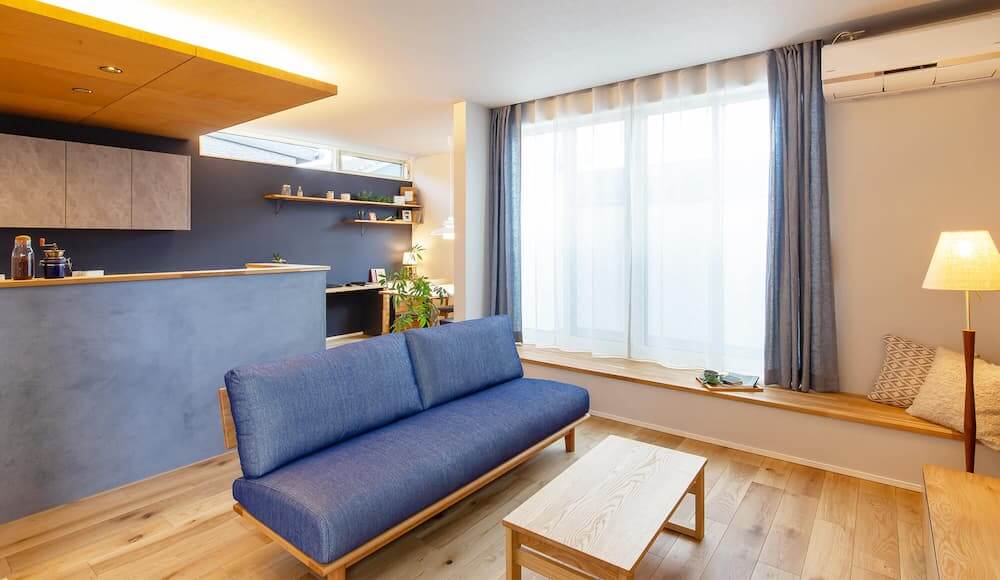 お引き渡しとともにプレゼントされるソファやダイニングセットなど家具の一部とカーテン、最新機種のエアコンは、同社のインテリアコーディネーターが厳選。