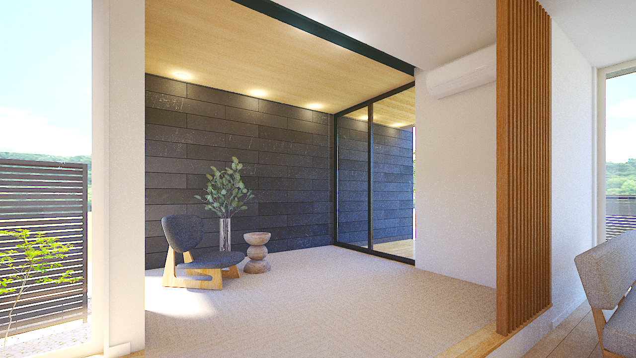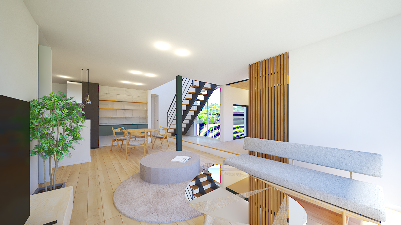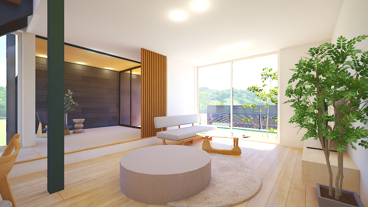 大きな開口部が自然の光と風をたっぷり取り込み、屋内にいながら季節のうつろいを感じられる空間に。和室も隣接し、くつろぎの時間がさらに豊かに。