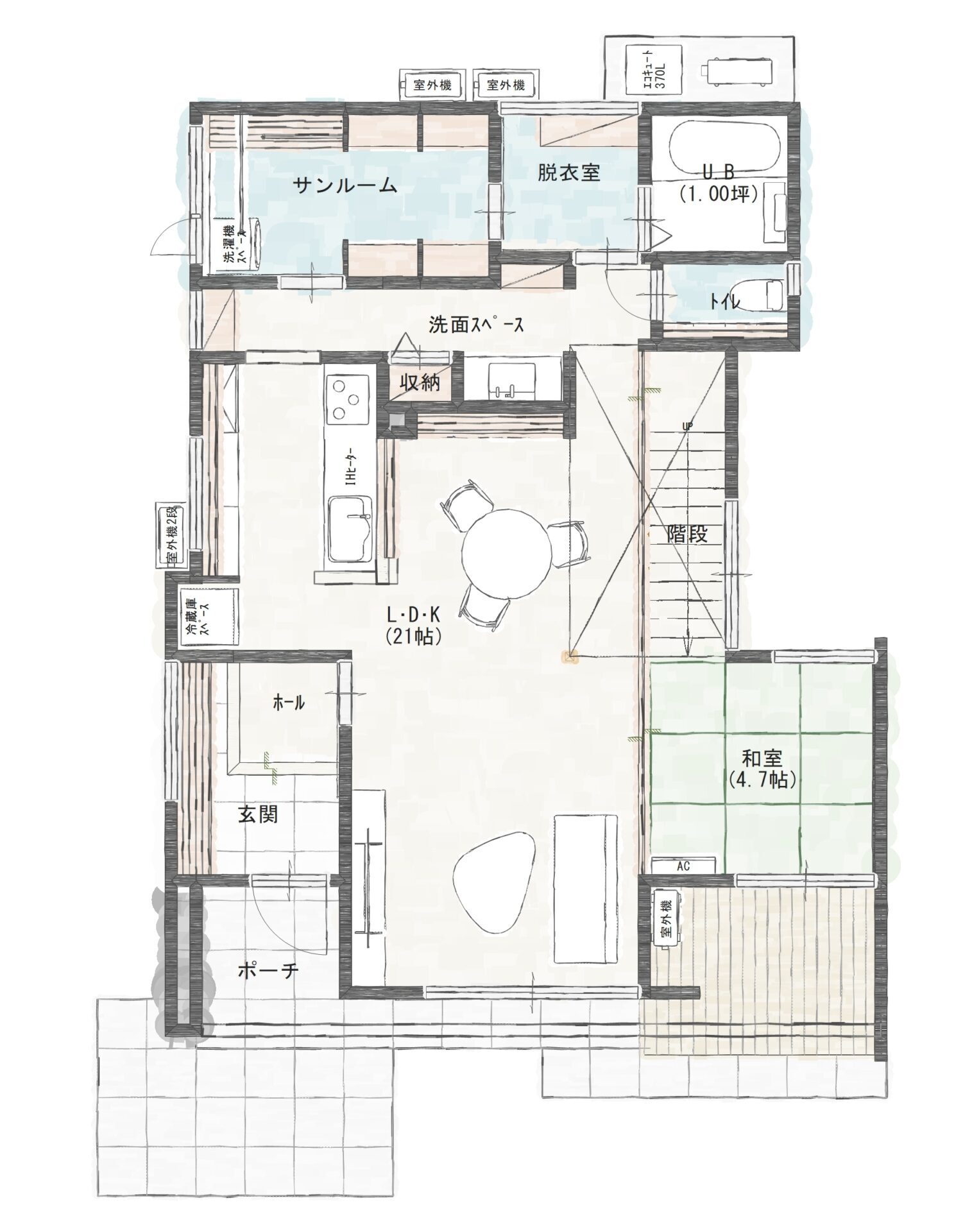 キッチン → 洗面 → 物干しスペースをぐるっと回れる動線で、移動がしやすく家事効率がアップ。行き止まりのない間取りが、忙しい毎日にゆとりをもたらします。