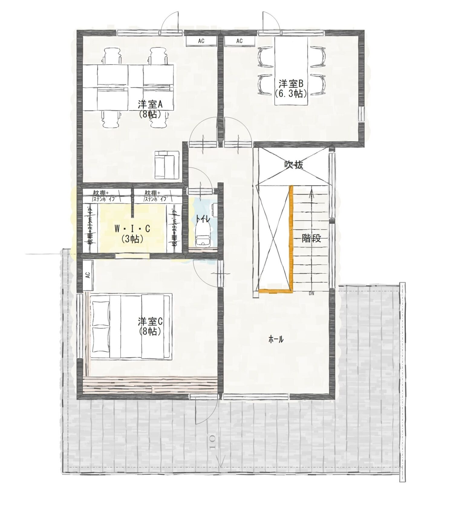 2階は柔軟に使える洋室を確保。子どもの成長や暮らしの変化に合わせて、長く快適に暮らせる工夫が詰まっています。