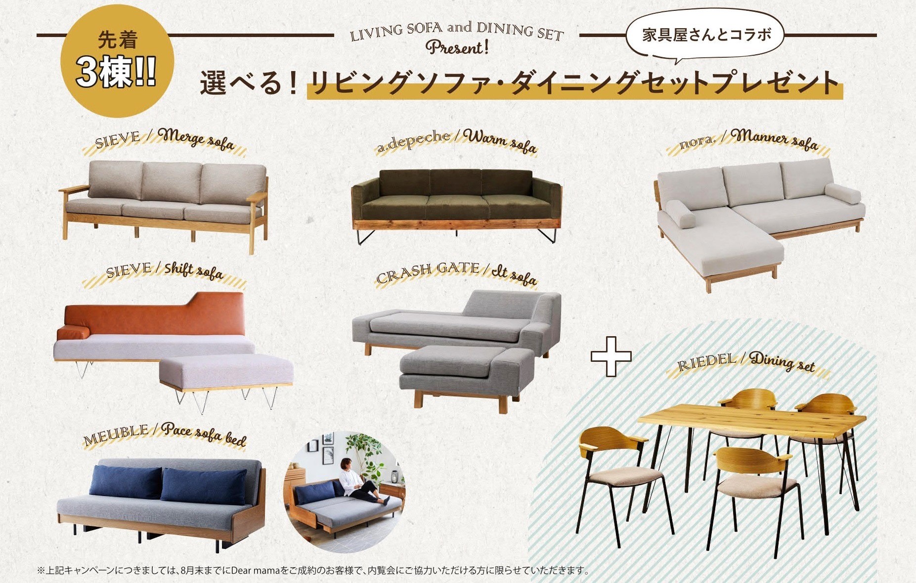 期間中、弊社商品「Dear ⅿama」をご成約のお客様【先着3棟限定】に上記リビングソファ・ダイニングセットをプレゼント!