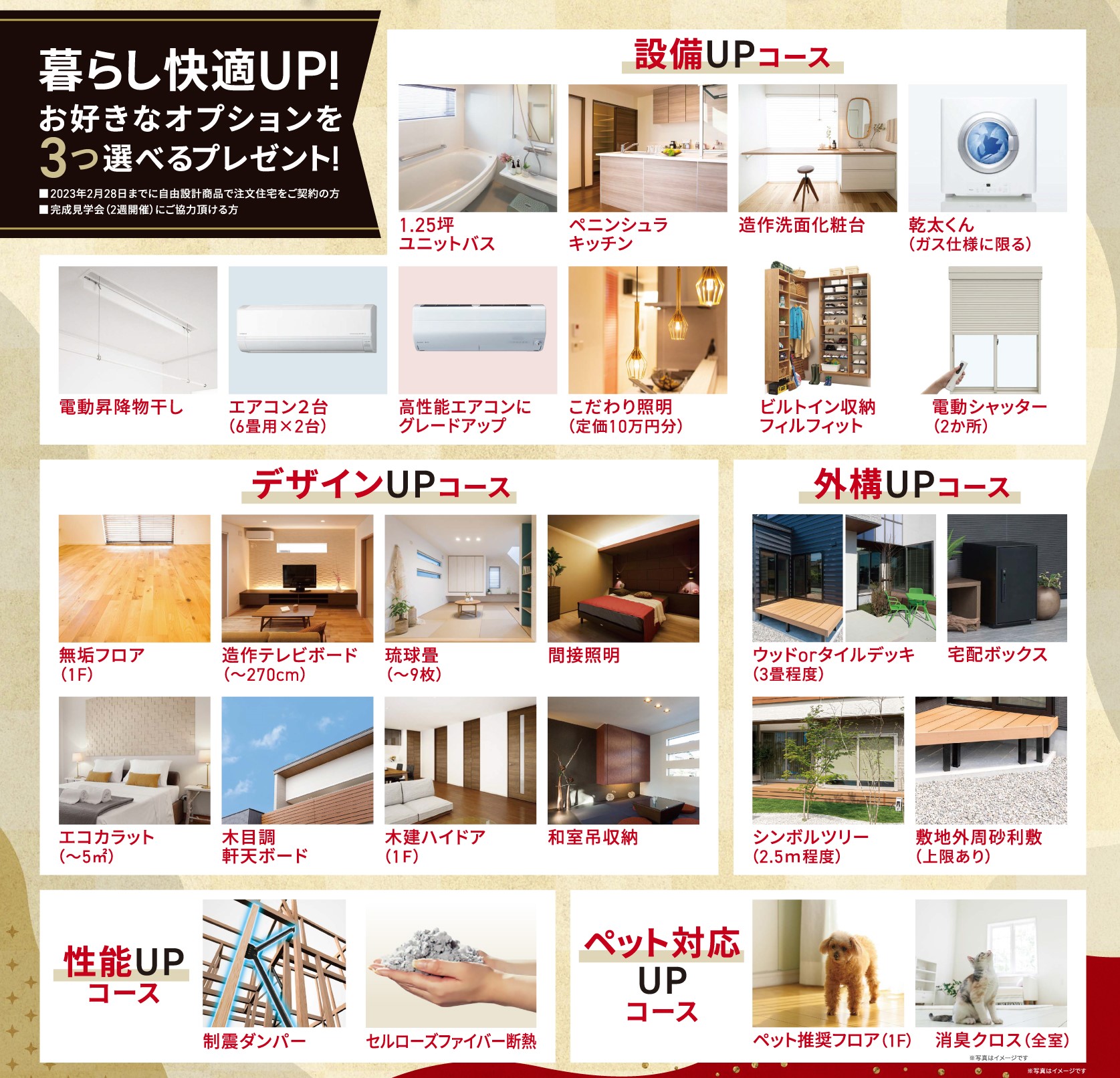 以下のオプションの中から最大3つまでをご契約頂くお住まいにプレゼント致します。(各コースを跨いでのご選択も可能です。)