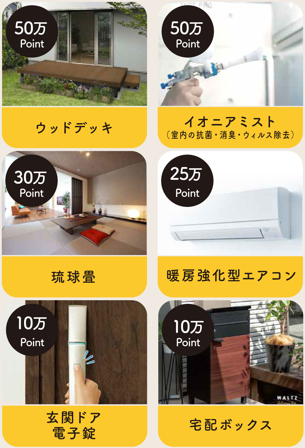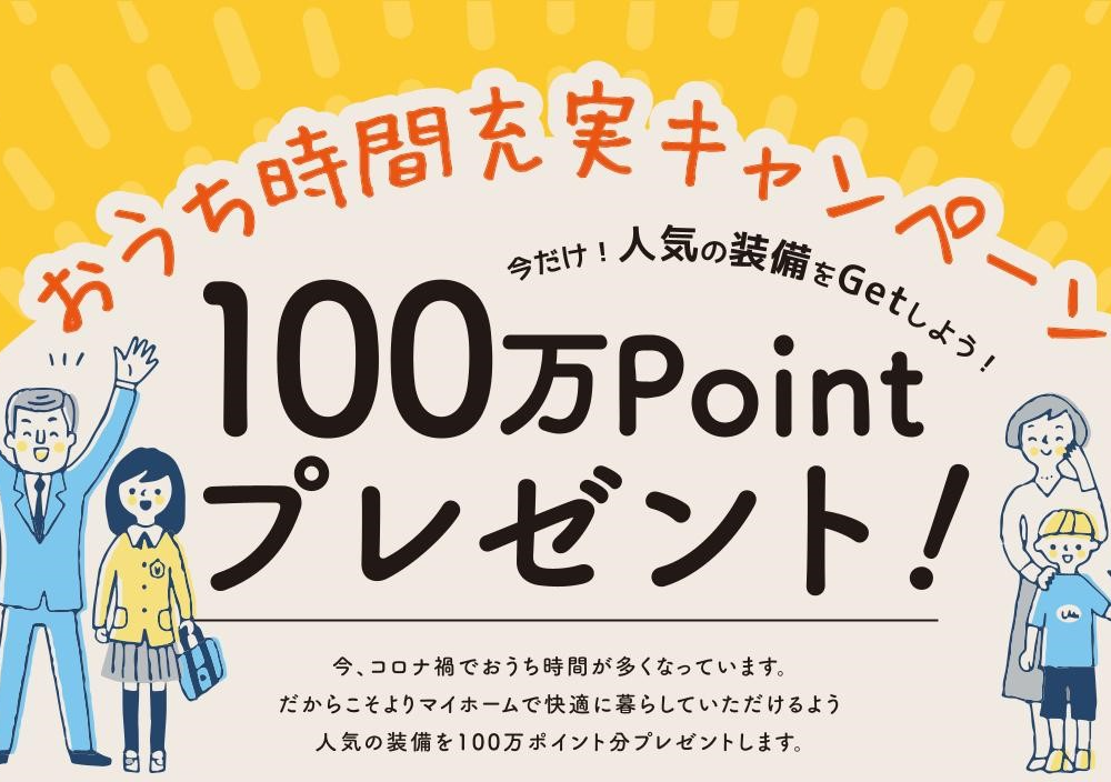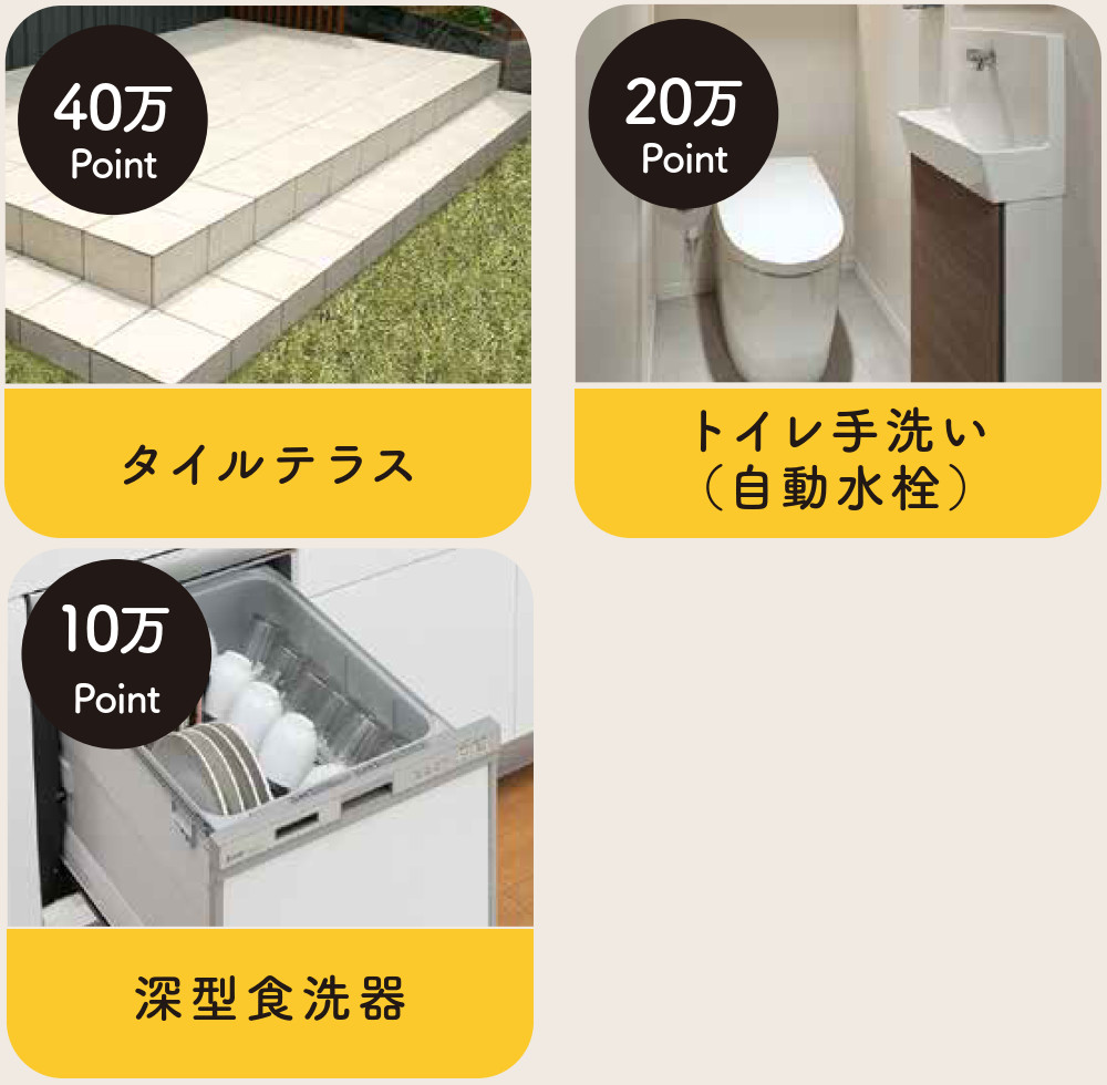 通常有償オプションとなる以下の設備の中から最大100万ポイント分を、ご契約いただくお住まいに無償で追加頂けます。