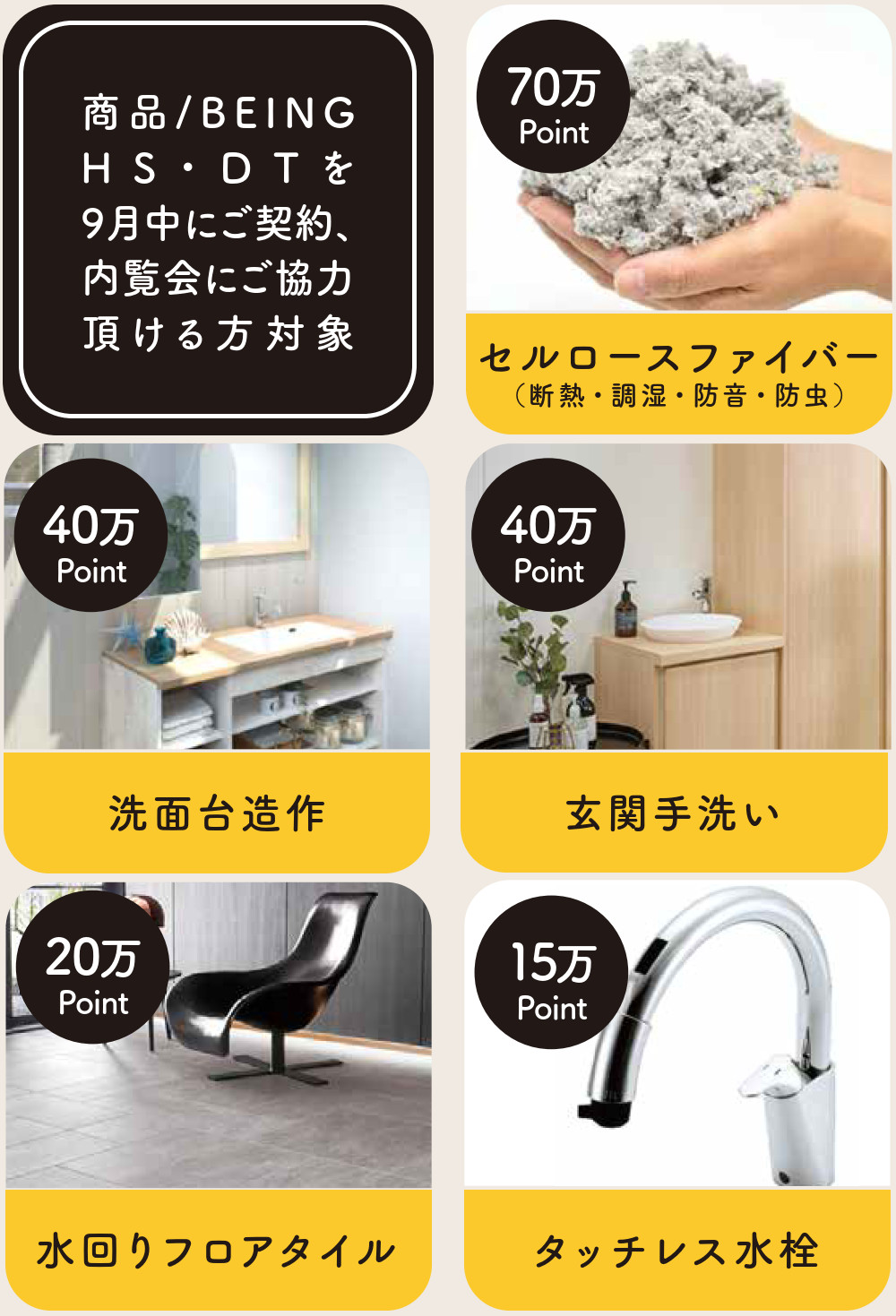 期間中、弊社商品「BEING HS」または「BEING DT」にて新築住宅をご契約いただいた方を対象に、セルローズファイバー・ウッドデッキなどの豪華設備と交換できるポイントを100万ポイントプレゼントさせて頂きます。