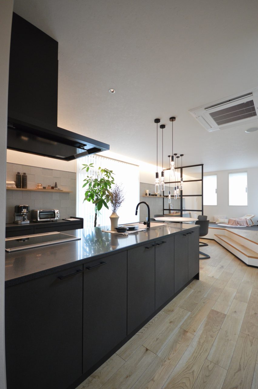 ブラックの前面収納付きキッチン。