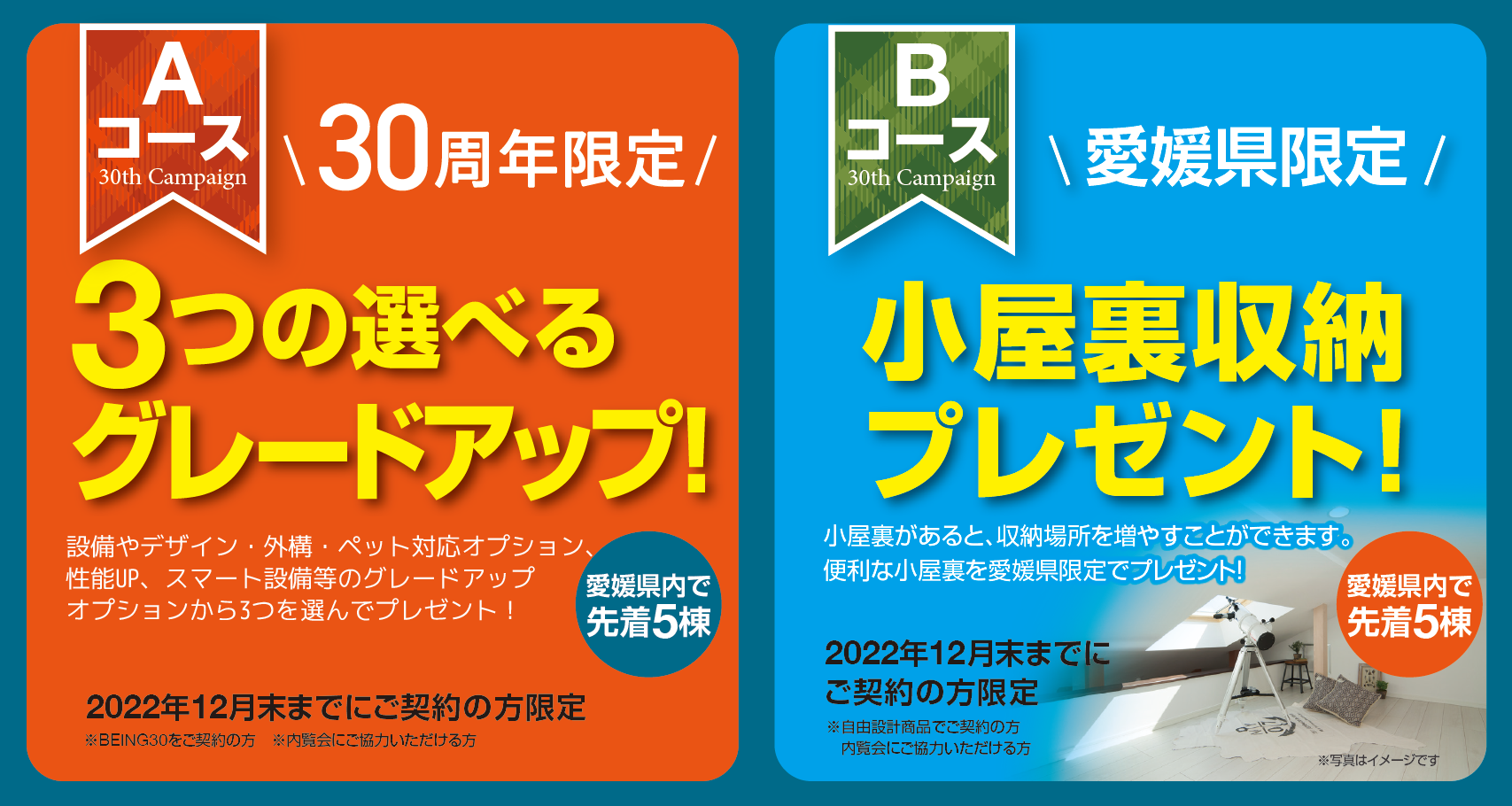 キャンペーン期間中にお申し込み頂き、弊社商品BEING30にて、2022年12月31日までにご契約をいただける方、【愛媛県内で先着5棟】