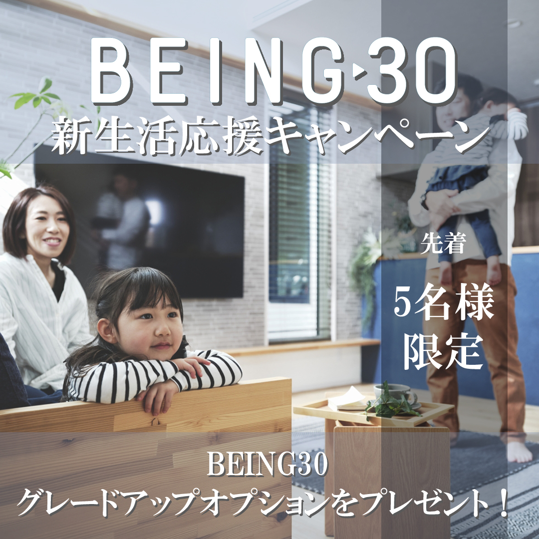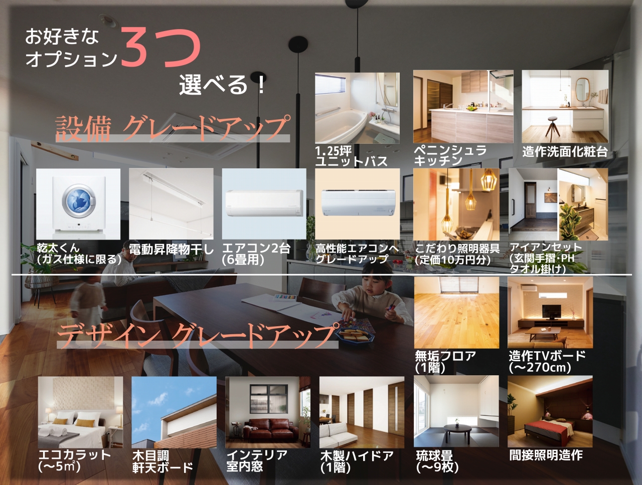 期間中、弊社商品BEING30にて新築住宅をご契約いただいた方を対象に、グレードアップができるオプションを最大3つまでプレゼント!