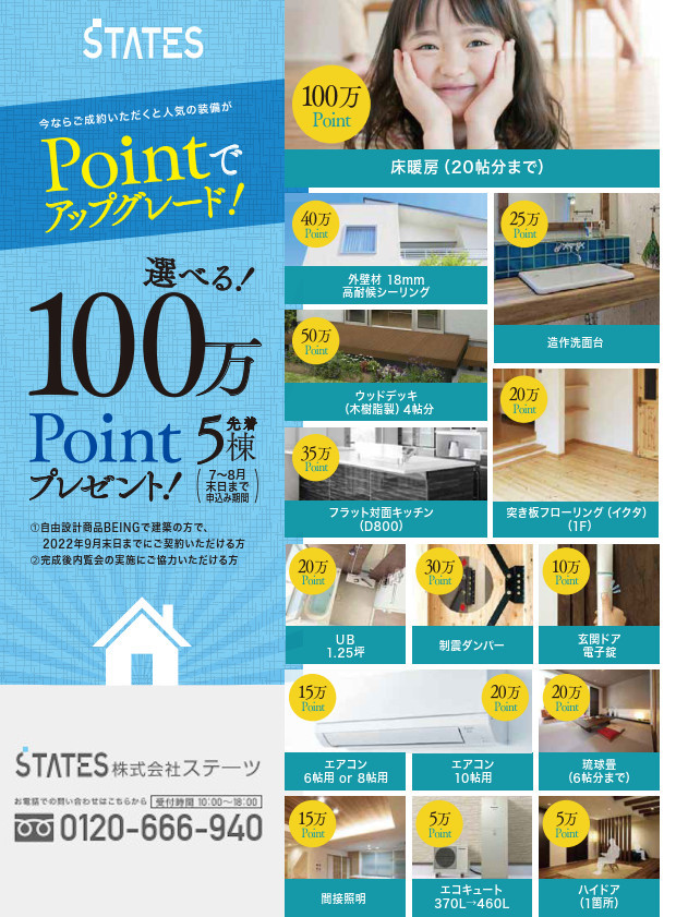 期間中、弊社商品BEINGシリーズにて新築住宅をご契約いただいた方を対象に、様々な設備の追加やアップグレードに使えるポイントをプレゼント致します。