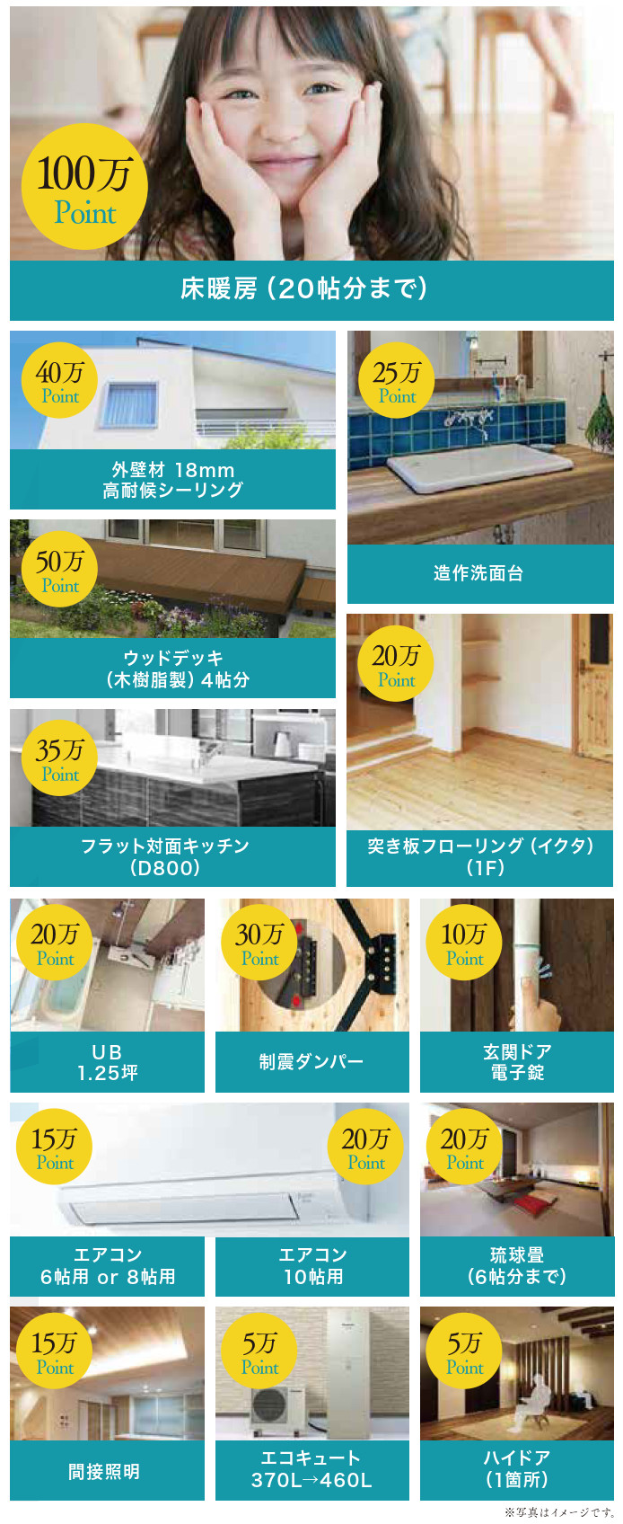 ご契約頂くお住まいに対して、以下の設備の追加、またはアップグレードに使えるポイントを100万ポイントプレゼント。組み合わせは自由に選択可能。
