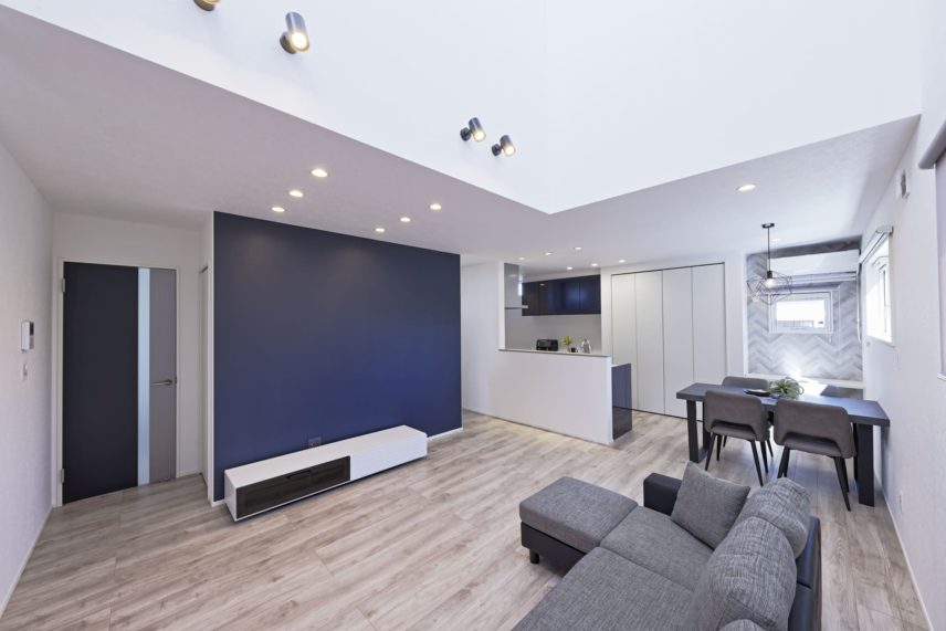 18.9帖の広々としたLDK+上部の吹き抜けで開放感抜群!納戸、ウォークインクローゼットなど収納も充実◎家具、カーテンがコーディネートされたモデルハウスのような建売住宅です。