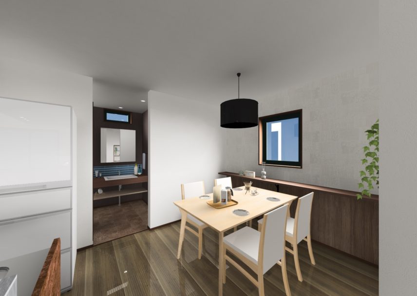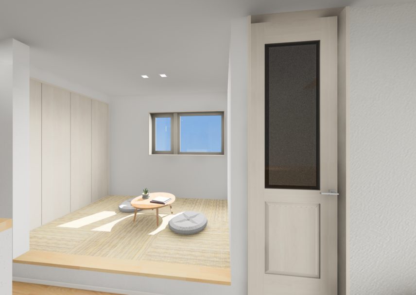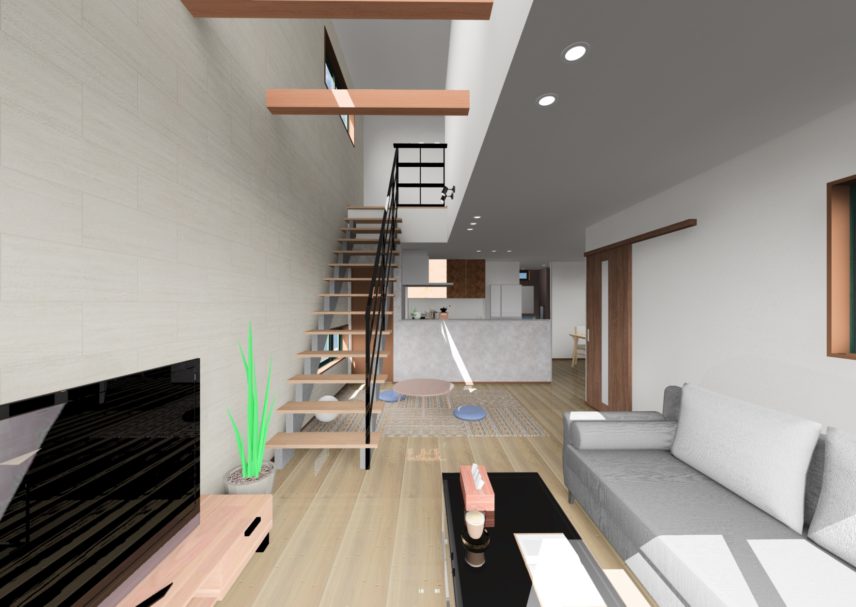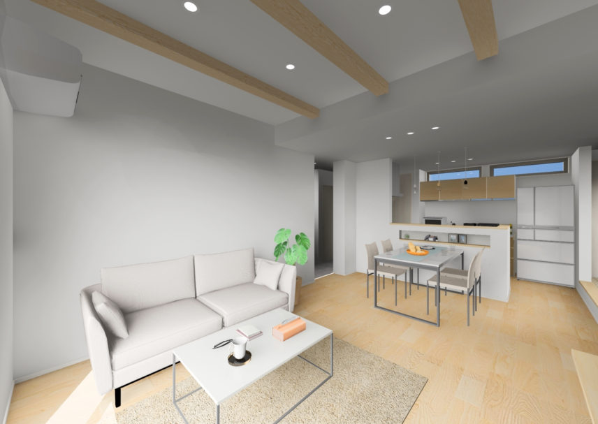 梁表しの織り上げ天井で広々としたLDK、隣接した小上がりスペースで更に開放的な空間を実現。白ベースの内観に木の温もり感じさせる落ち着いたデザインに仕上がりました。