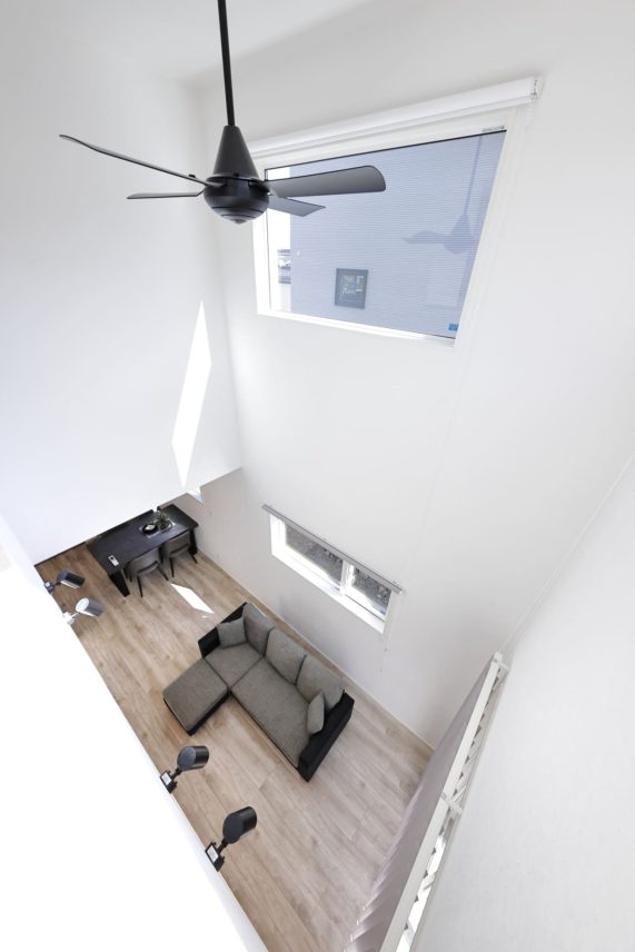 21帖の広々としたLDK、リビング上部は吹き抜けで開放的な空間に。キッチンはLDK全体を見渡せるパパママ安心の対面式のアイランド型で使い勝手も◎