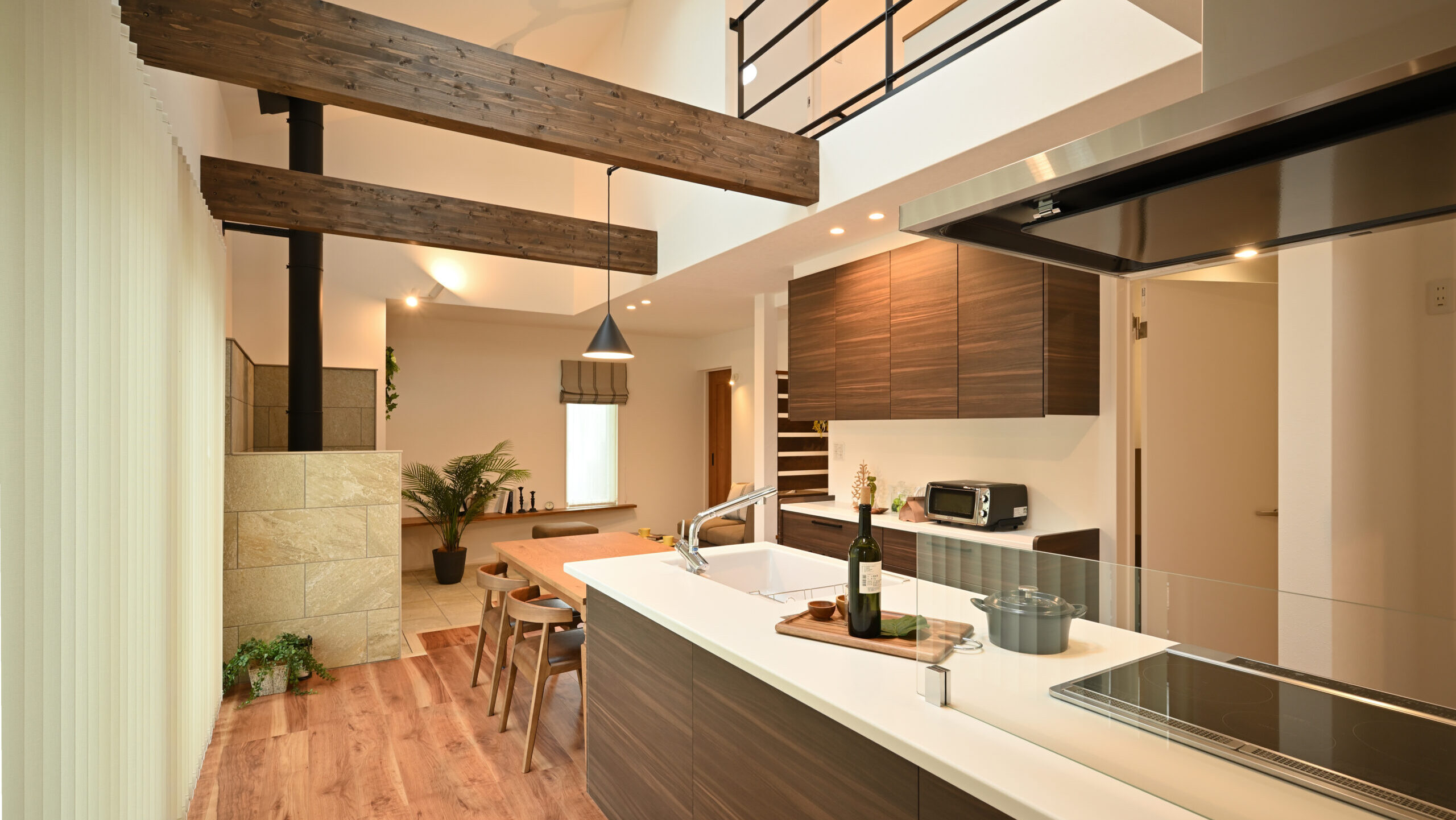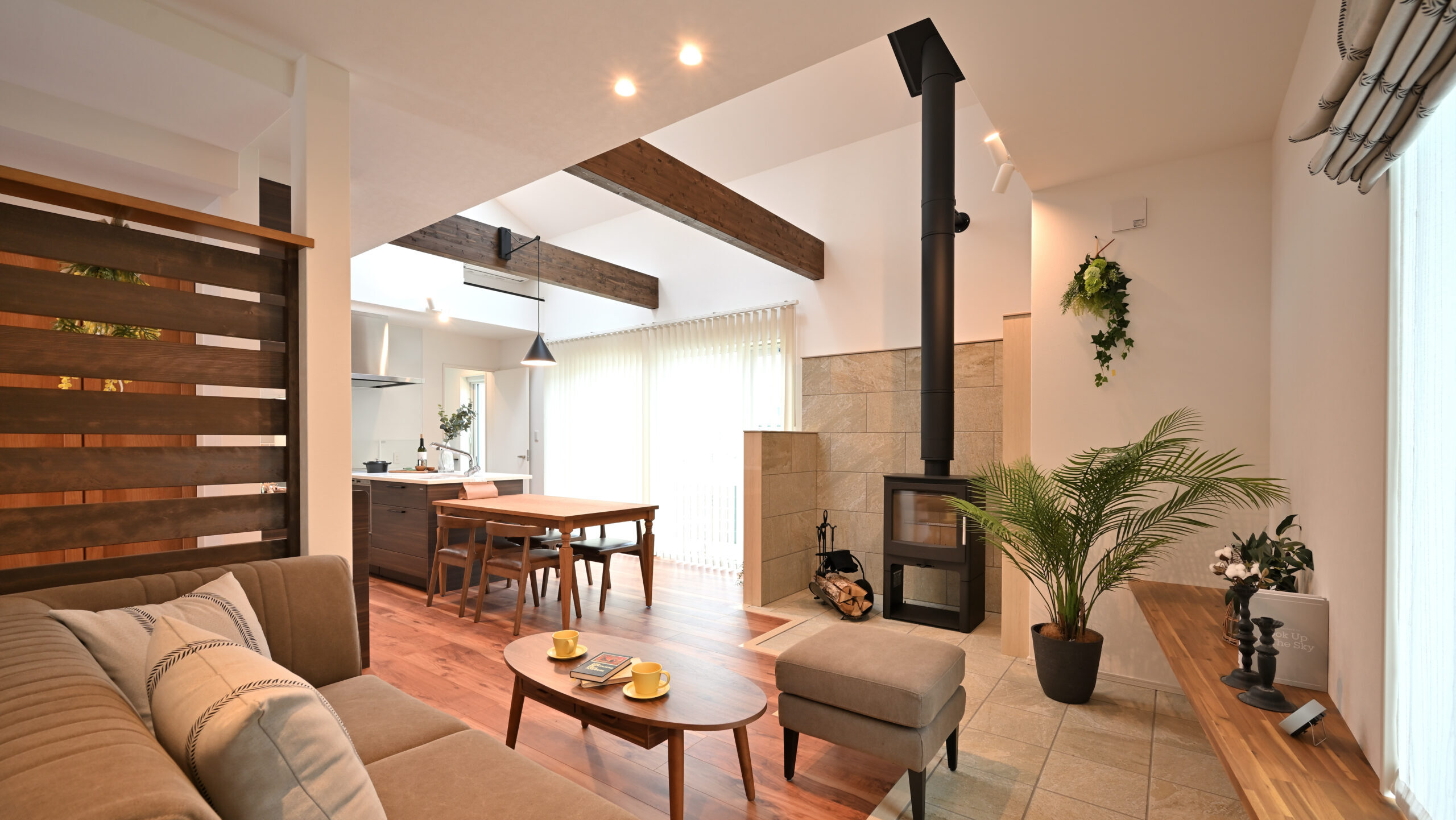 タイルデッキや薪ストーブを備え、他にはない特別感を実現