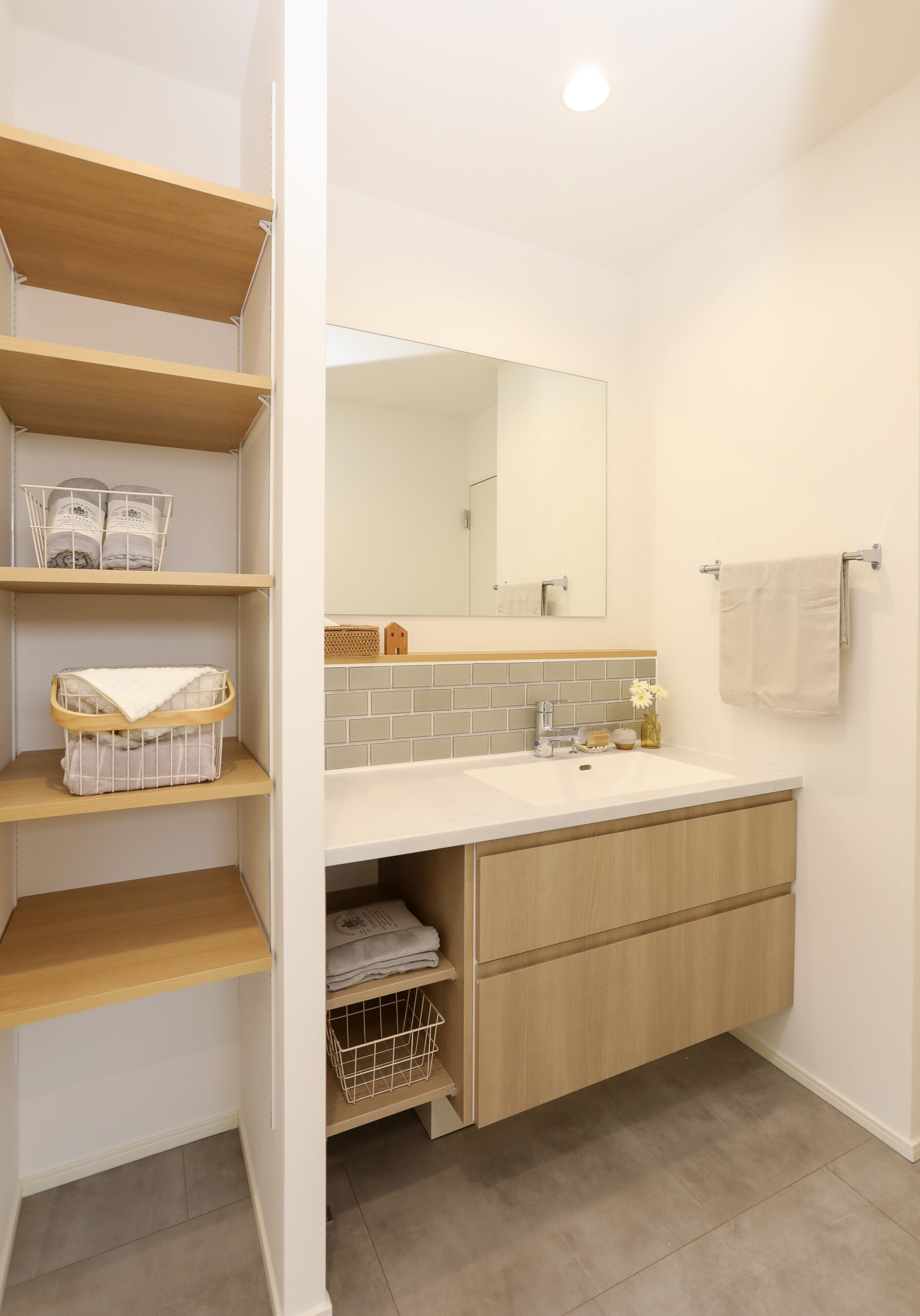 洗面台横に設けた可動棚で、タオルや日用品をすっきり整理