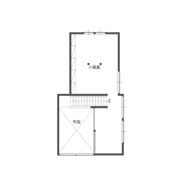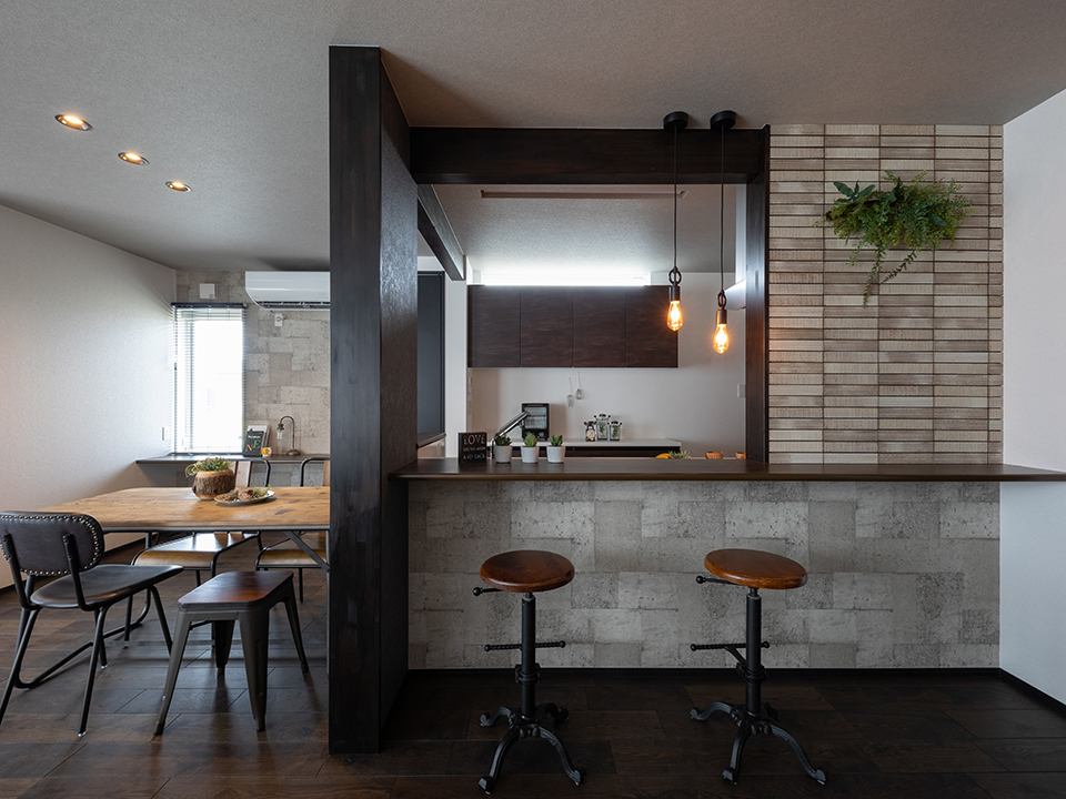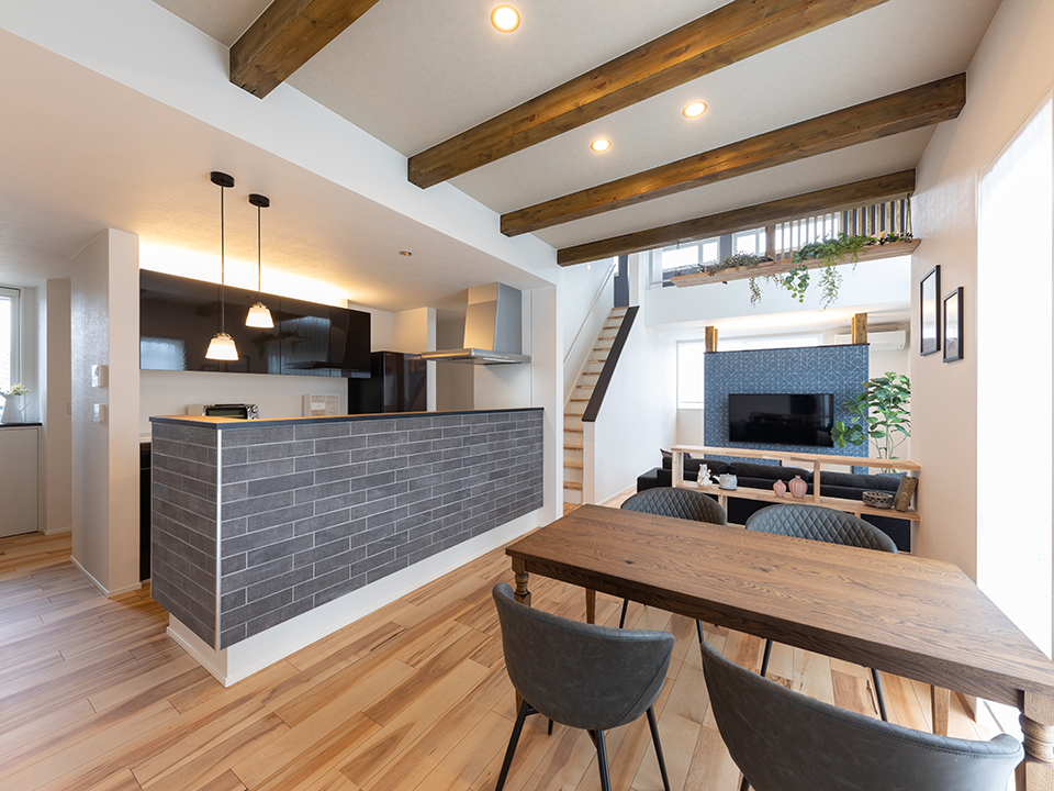 ダークカラーで重厚感のある外観。1階はカウンターキッチンを中心に、お店にいるようなカフェスタイルを体験できるシックなカラーデザインでまとめています。2階は素材感を活かしたやわらかなナチュラステイストの居住空間を満喫できるカタチに。
