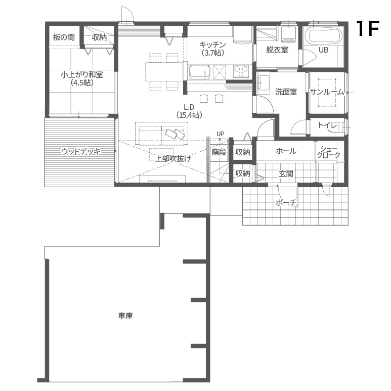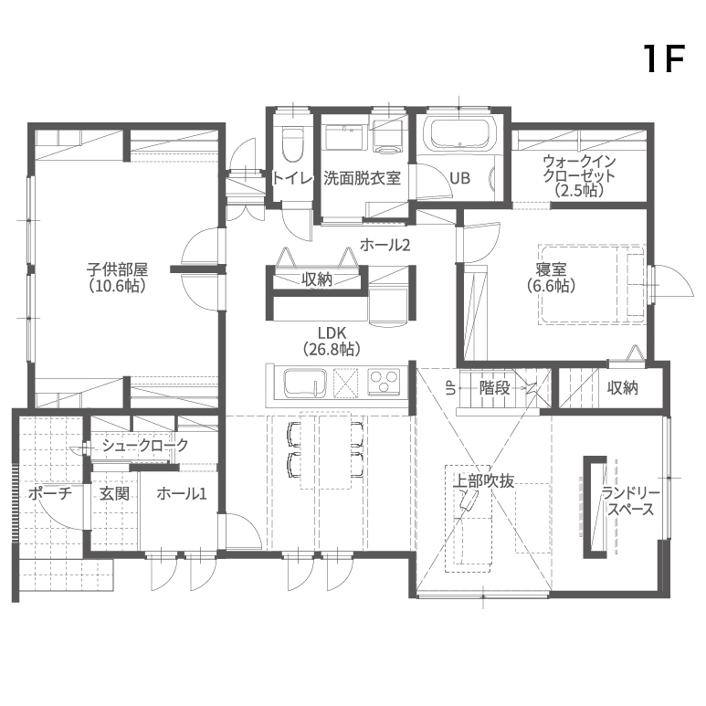 1棟目はなだらかな片流れ屋根のモダンな外観。敷地を合理的に広く使い、平屋建てながらLDK、水回り、3つの居室を全て備えたモデルハウスです。平屋なのに階段があり、広くて便利な小屋裏収納とリビングが見下ろせる隠れ家スペースをお楽しみ頂けます。