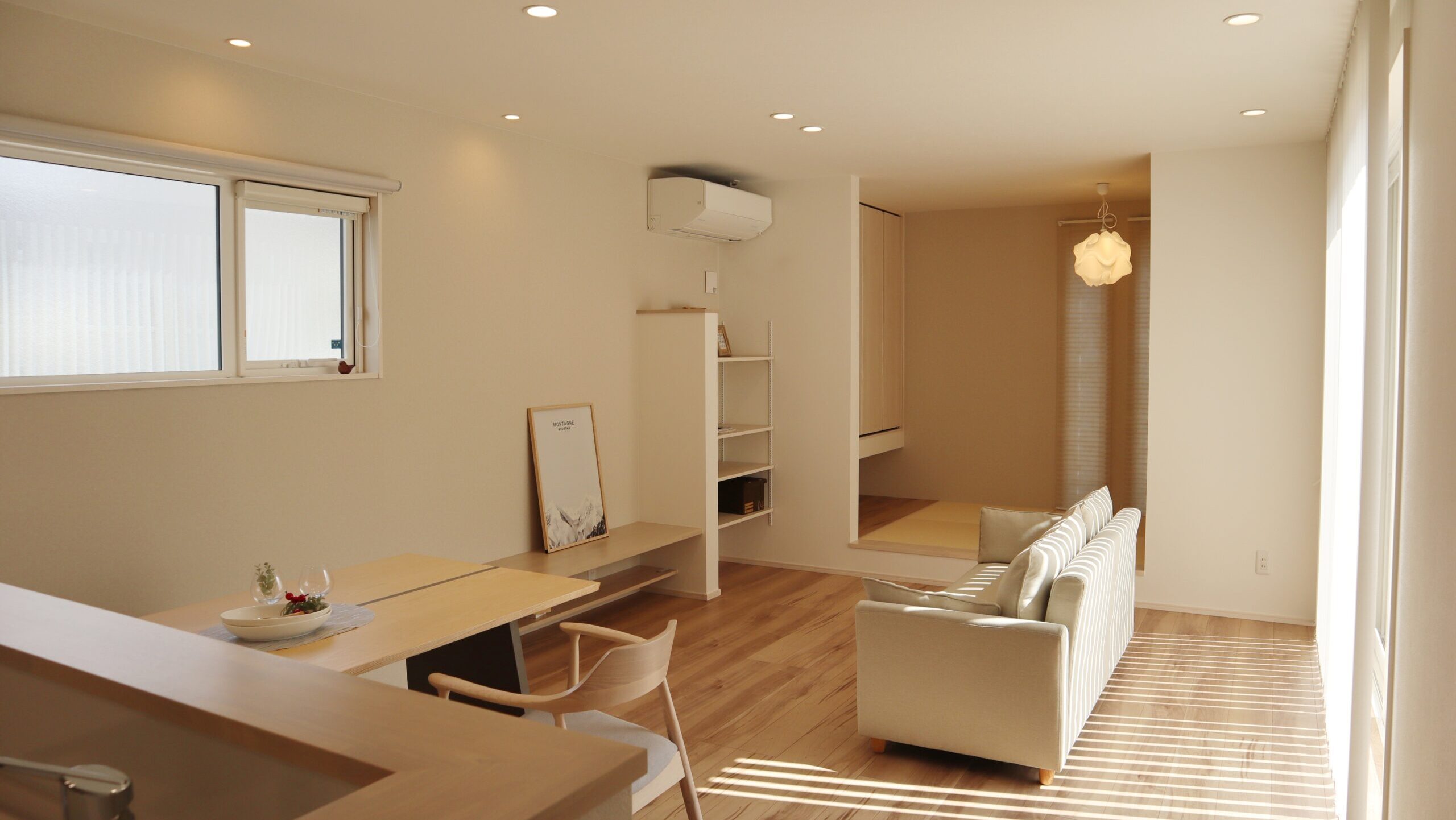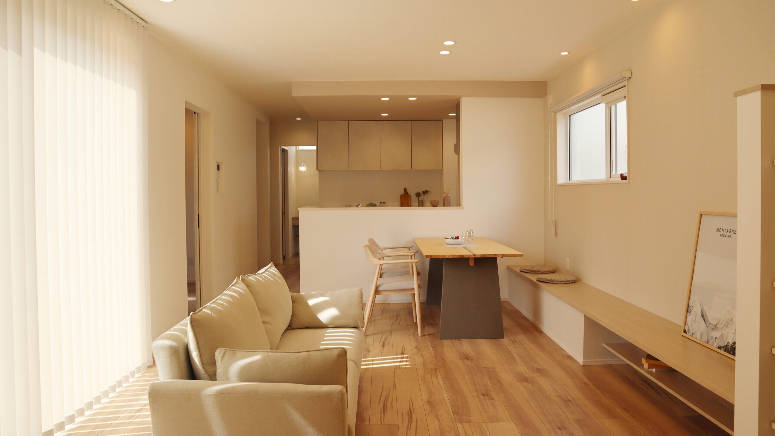 LDKには造作ベンチとTV台を備え付け、家具いらずの快適なリビング空間を演出