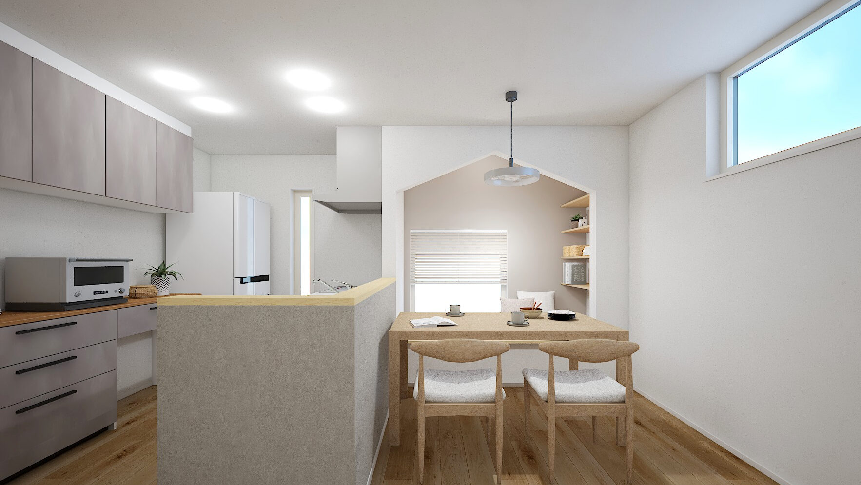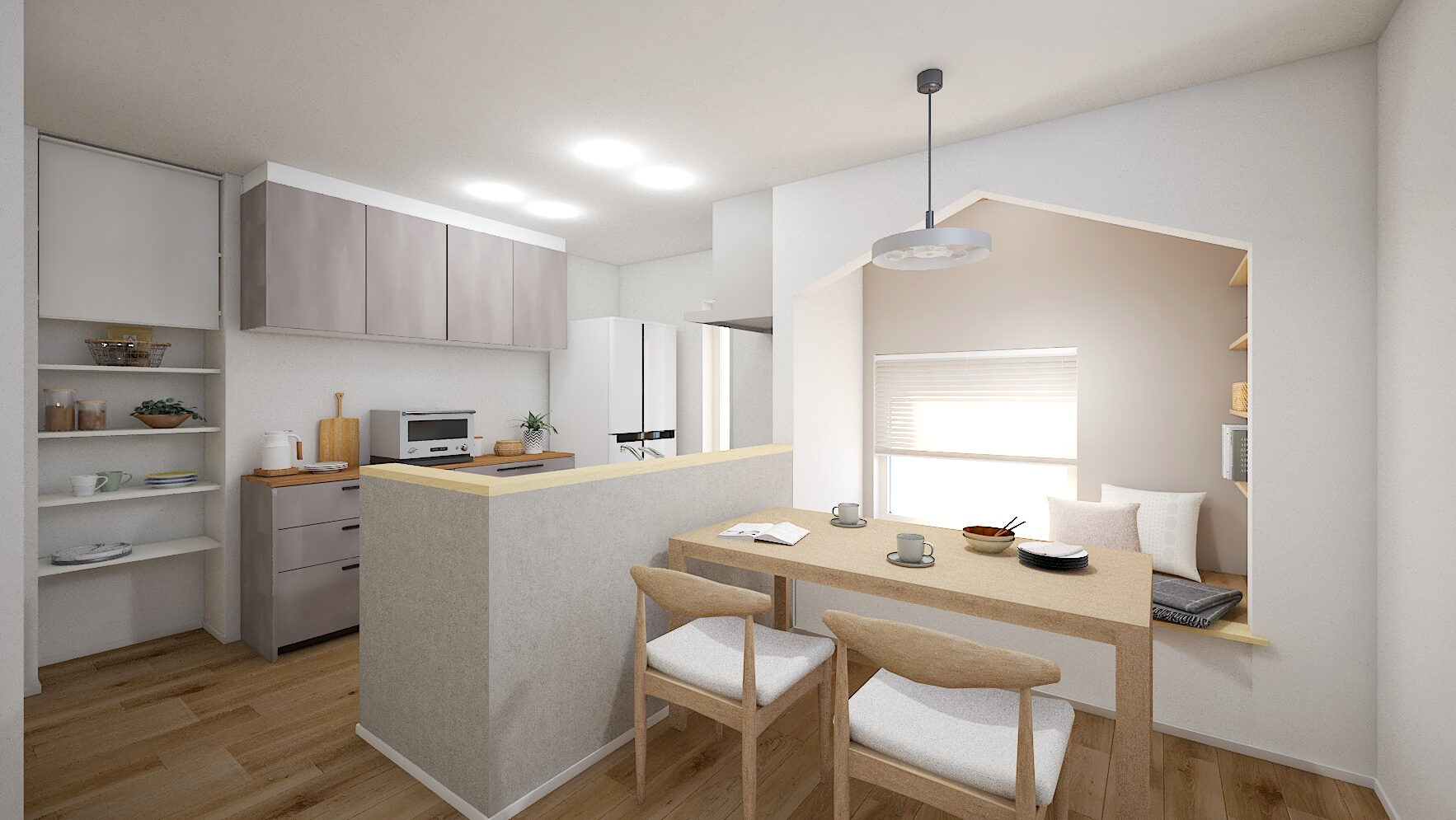 田園風景を活かしたダイニングヌックは、家族が自然を感じながらくつろげる特別な空間です💡