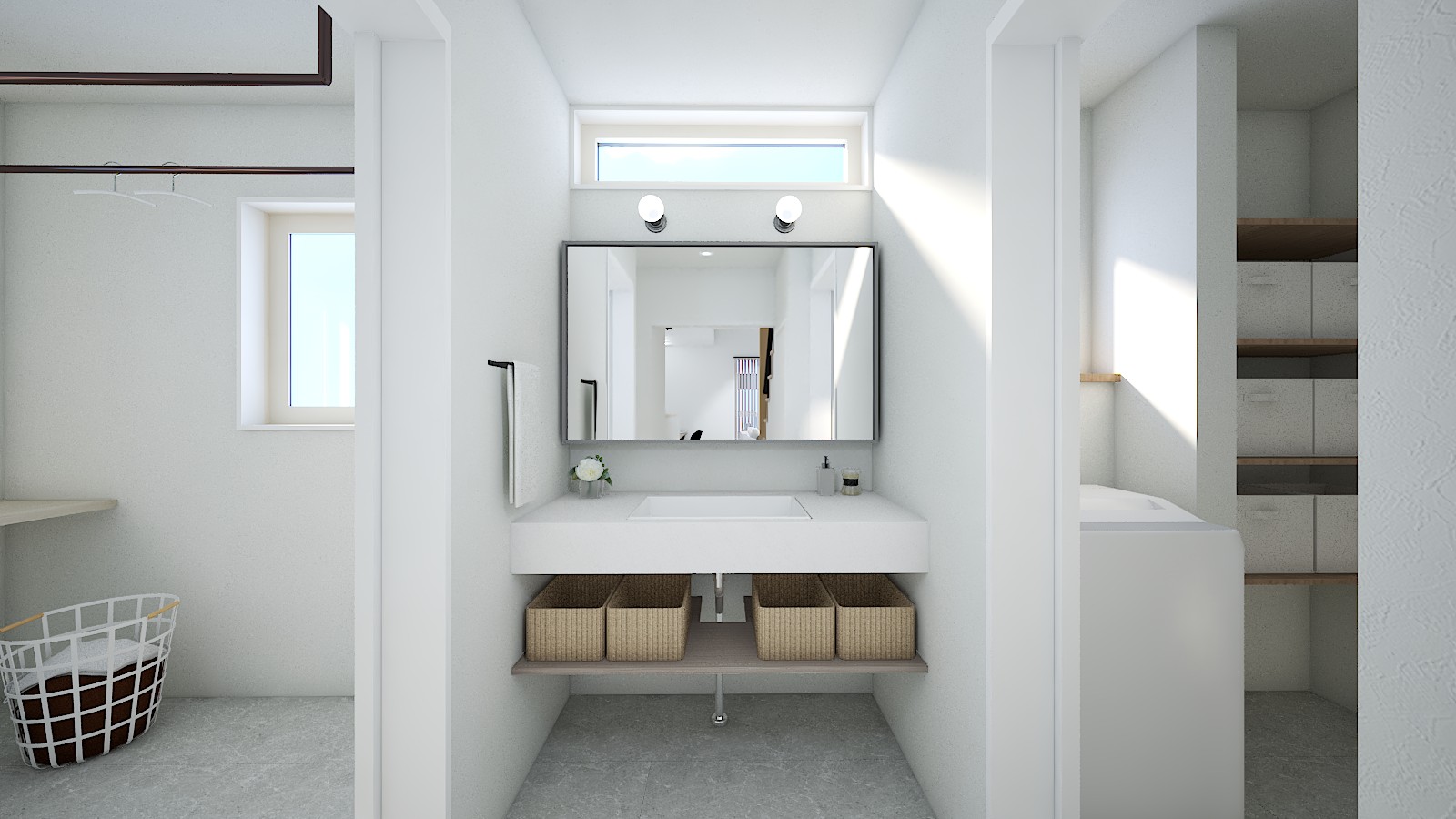 水回りに隣接してサンルームを設けた家事ラク動線とオシャレ造作洗面化粧台がLDKから見える位置に。