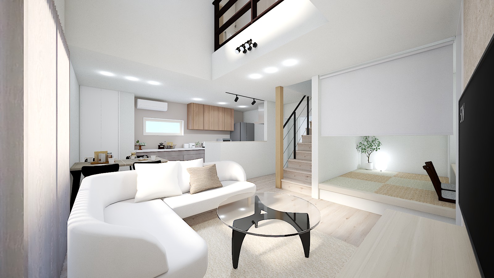 こもれる小上がりと開放的な吹抜けリビングが特徴のこだわり満載のお家です。