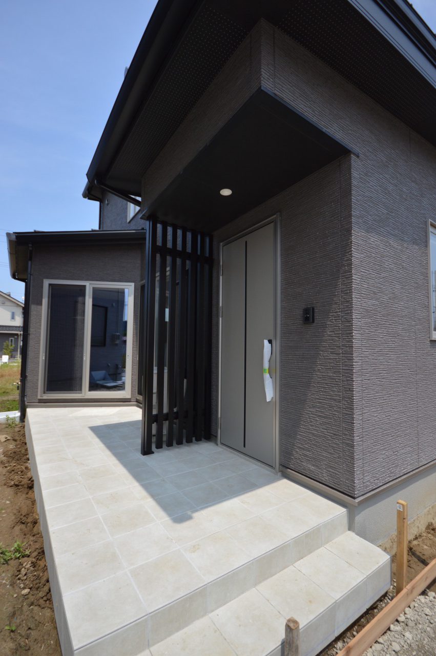 リビングからも玄関からも出られるタイルテラスのある住まい。